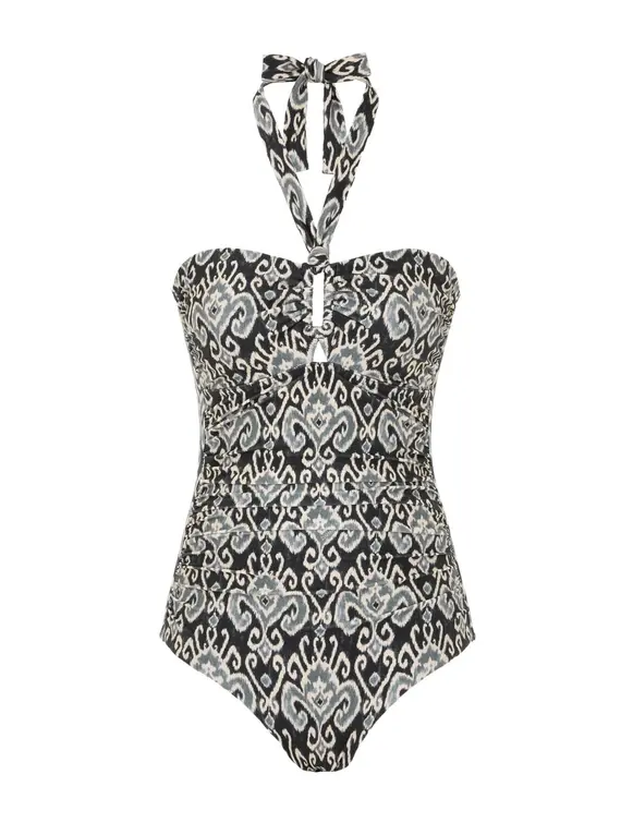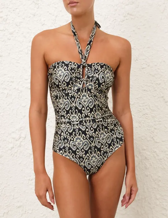 The Wylie Wide Link 1PC in Charcoal Ikat from our Resort Swim 2025 Collection. A halter neck one piece with ruching throughout the body and wide link detail at centre bust. Bandeau, halter one piece Full coverage bottoms Removable cups Gripper elastic and boning for hold and bust support