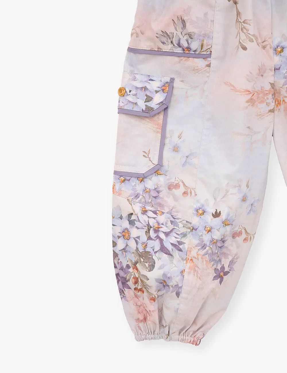 The Cascadian Kids Poplin Pants in Blue Botanical Floral from our Summer Swim 2025 Collection. A cotton pant featuring an elasticated waist and cuffs. 100% cotton fabric Quarter length kids pant Shirred waistband Fixed bow tie at centre front Front pockets with contrast edging