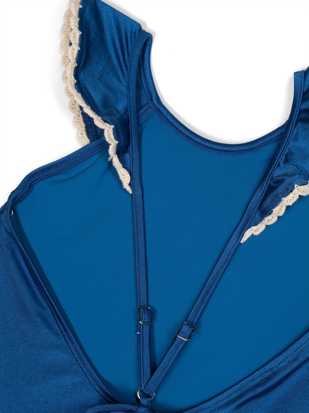 ▪navy blue ▪crochet trim ▪ruffled detailing ▪open back ▪adjustable spaghetti straps ▪round neck ▪sleeveless