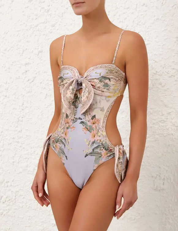 The Wylie Scarf Tie 1PC in Blue Floral from our Resort Swim 2025 Collection. A lycra one piece featuring bow details on front and side with an open back. Lycra one piece Placement print Adjustable detachable straps Boning inserted at side seam Open back detail