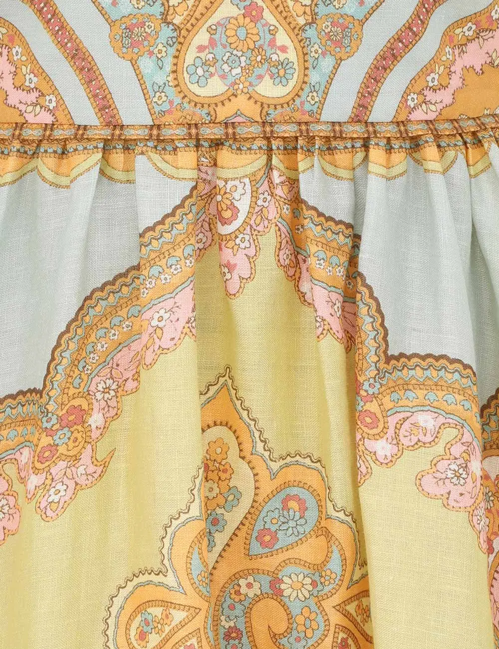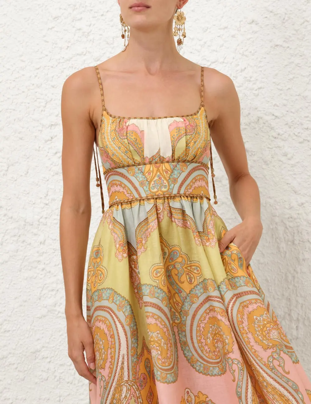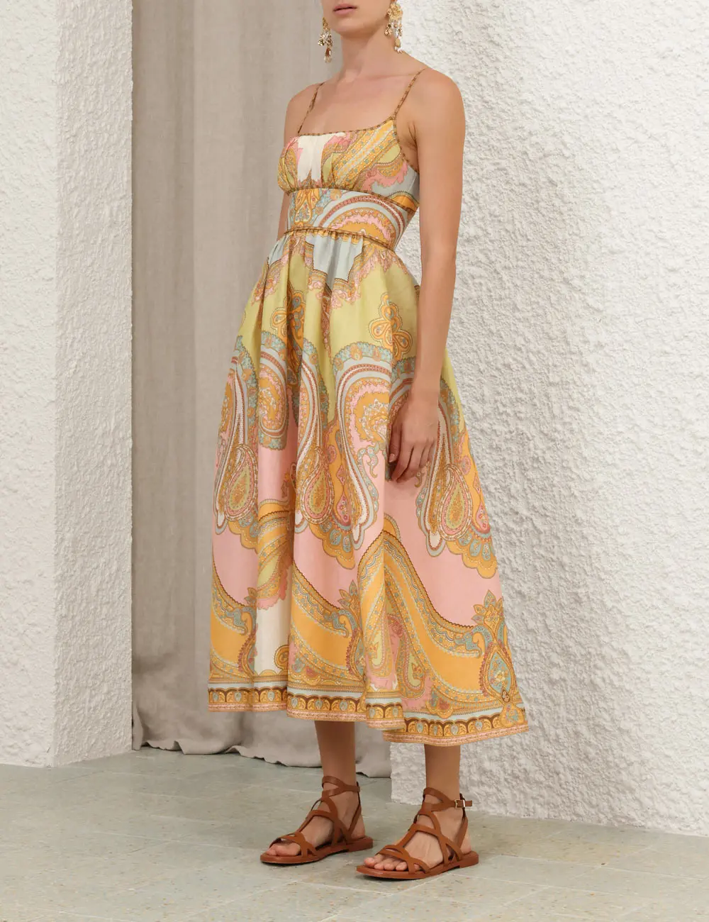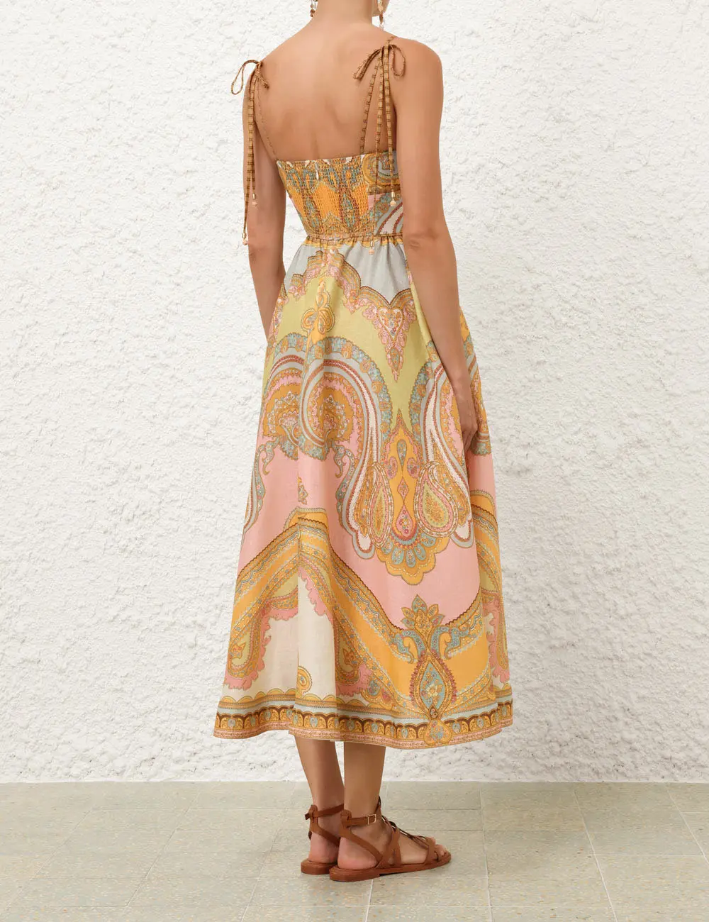 The Maxine Picnic Midi Dress in Gold Paisley from our Resort Swim 2025 Collection. A linen midi dress featuring a fitted bustier with heavy gathering, a shirred back bust and self tie shoulder straps. Linen midi dress Placement print Self tie shoulder straps with toggles Flat piping inserts Invisible zip at centre back