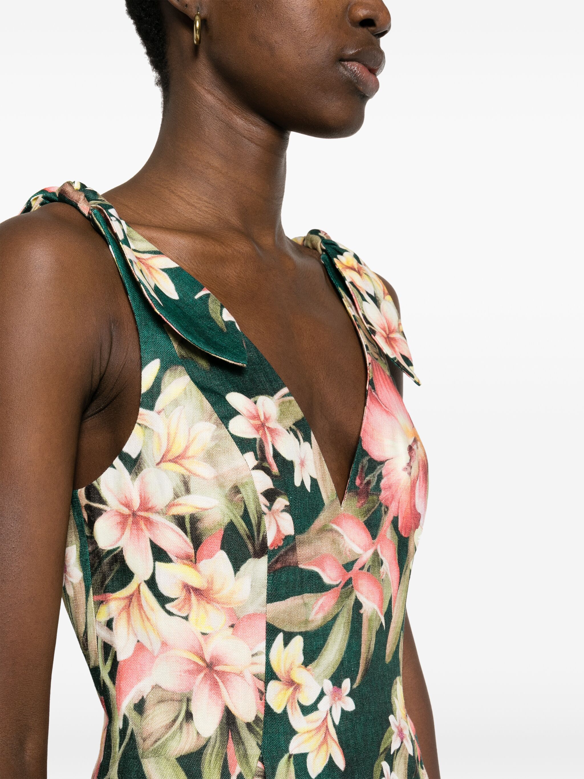 ▪green ▪multicolour ▪ linen/flax ▪all-over floral print ▪plunging V-neck ▪self-tie shoulder straps ▪dart detailing ▪inverted pleat ▪slip pockets to the sides ▪V-back ▪thigh-length ▪cotton lining ▪concealed rear zip fastening