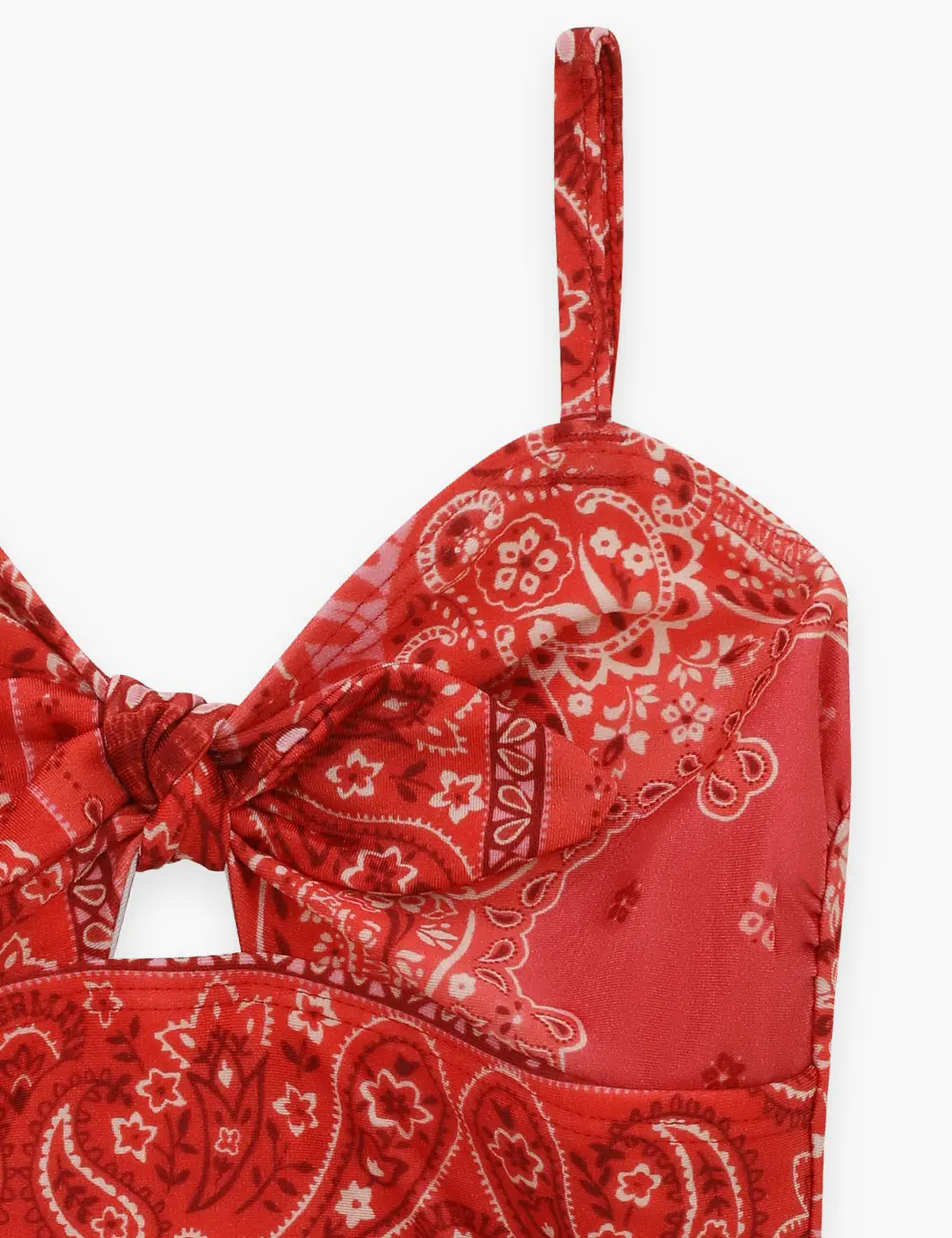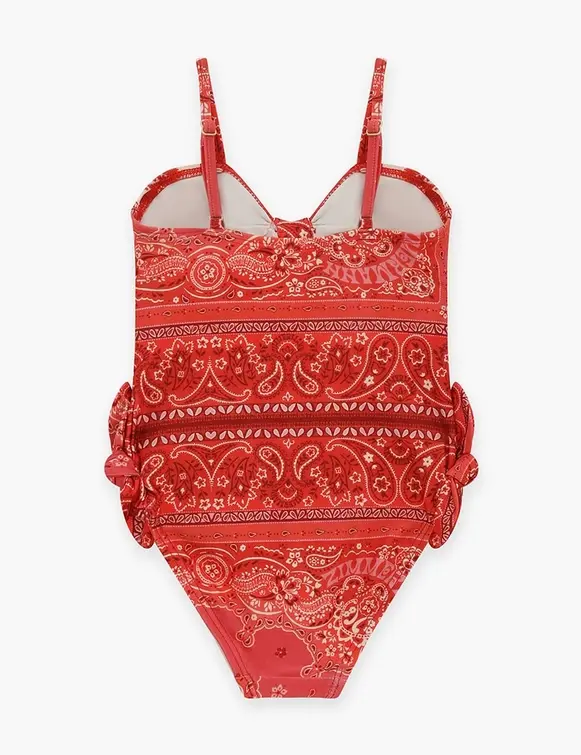 The Lucky Kids Tie Front 1PC in Red Bandana from our Summer Swim 2025 Collection. A kids one piece featuring a contrasting pattern and bow detailing at the front bust and on the side of the hip.