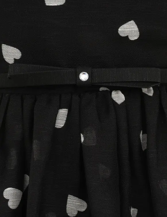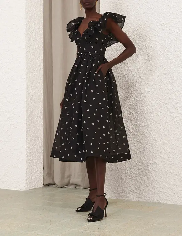 The Crush Frilled Midi Dress in Black Hearts from our Resort 2025 Collection, Crush. A silk linen mini dress featuring a sweetheart neckline with a plunging V-wire, frills on the shoulders, and a removable bow belt, finished with a full skirt.