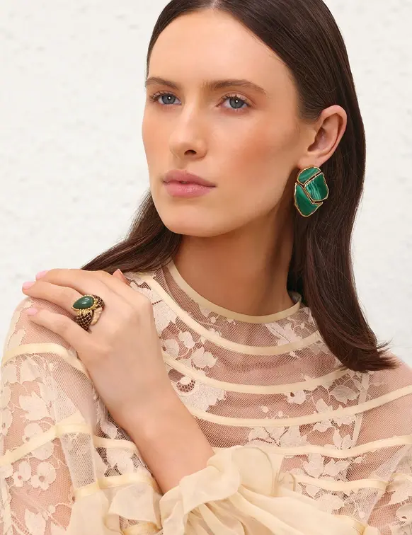 The Byron Earrings in Gold/Malachite from our Cruise 2026 Collection, Twisted Romance. A large gold plated stud earring featuring fragmented sections that create a textured, sculptural look. 16KT gold plated stud earring Fragmented sections throughout Stud post back Sold as a pair