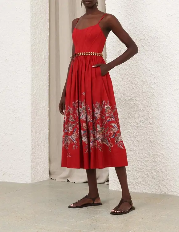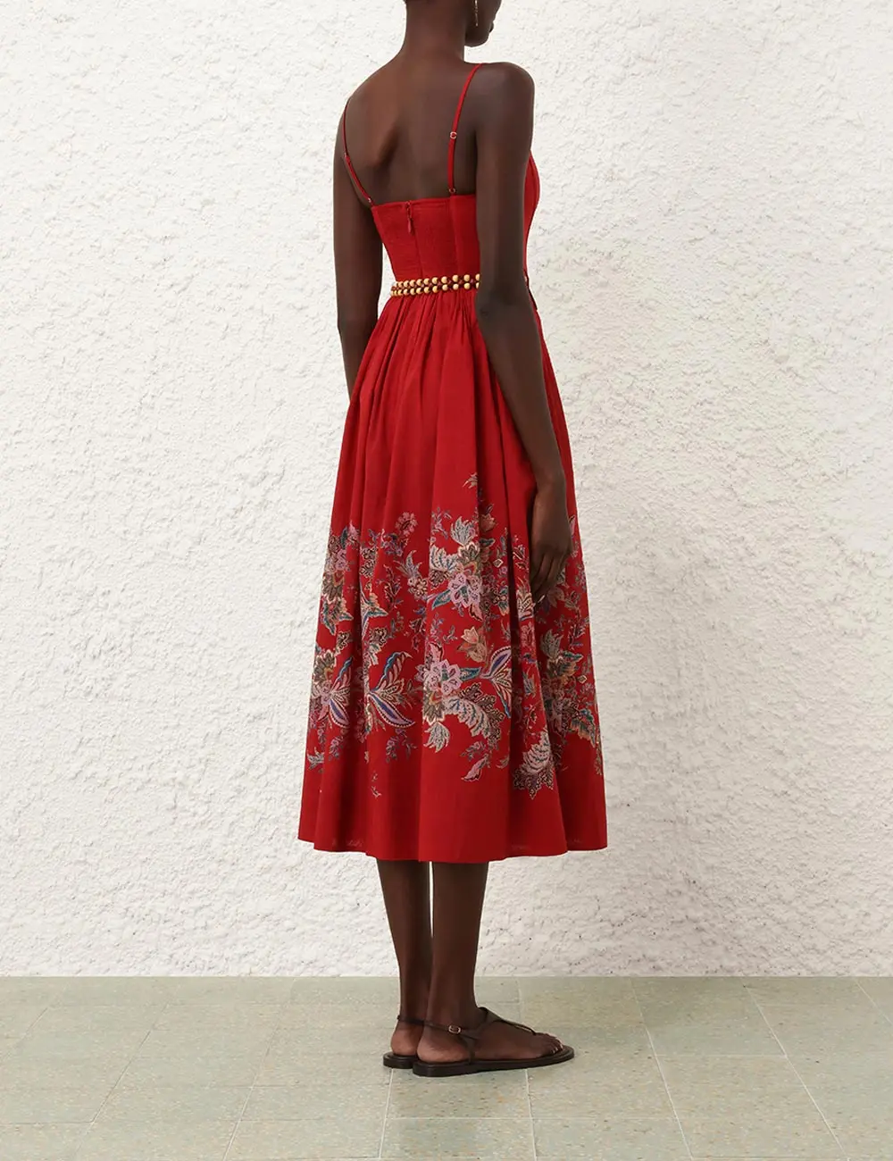 The Rhiannon Corset Midi Dress in Red Multi Paisley from our Summer Swim 2025 Collection. A cotton midi dress featuring a structured bodice, scoop neckline, a gathered waist and loose fit skirt. 100% cotton fabric Heavily gathered waist Boning in the bodice Adjustable straps Shirred back panel with centre back zip closure Side seam pockets Lined skirt
