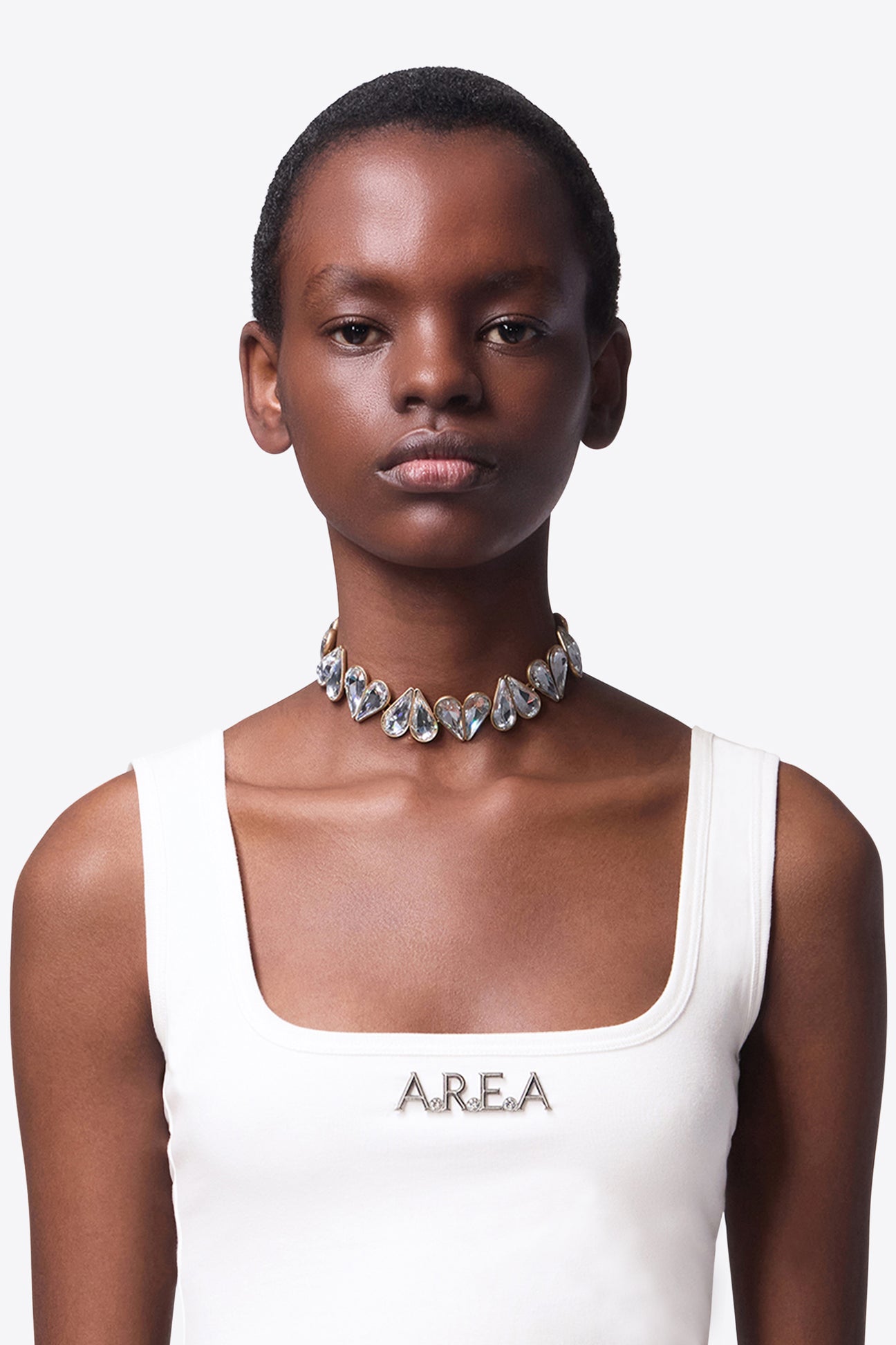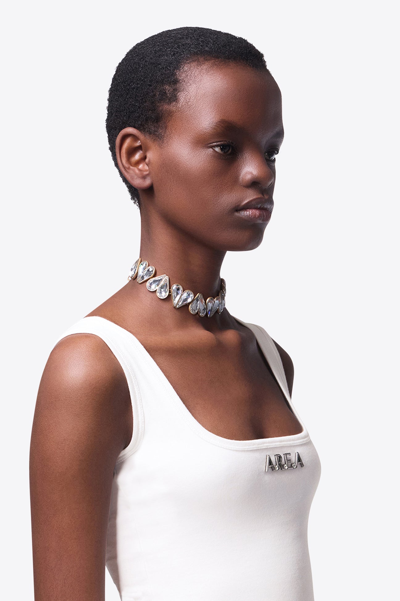 Crystal heart choker featuring lobster claw clasp and 'A' charm at the end. Available in Gold.