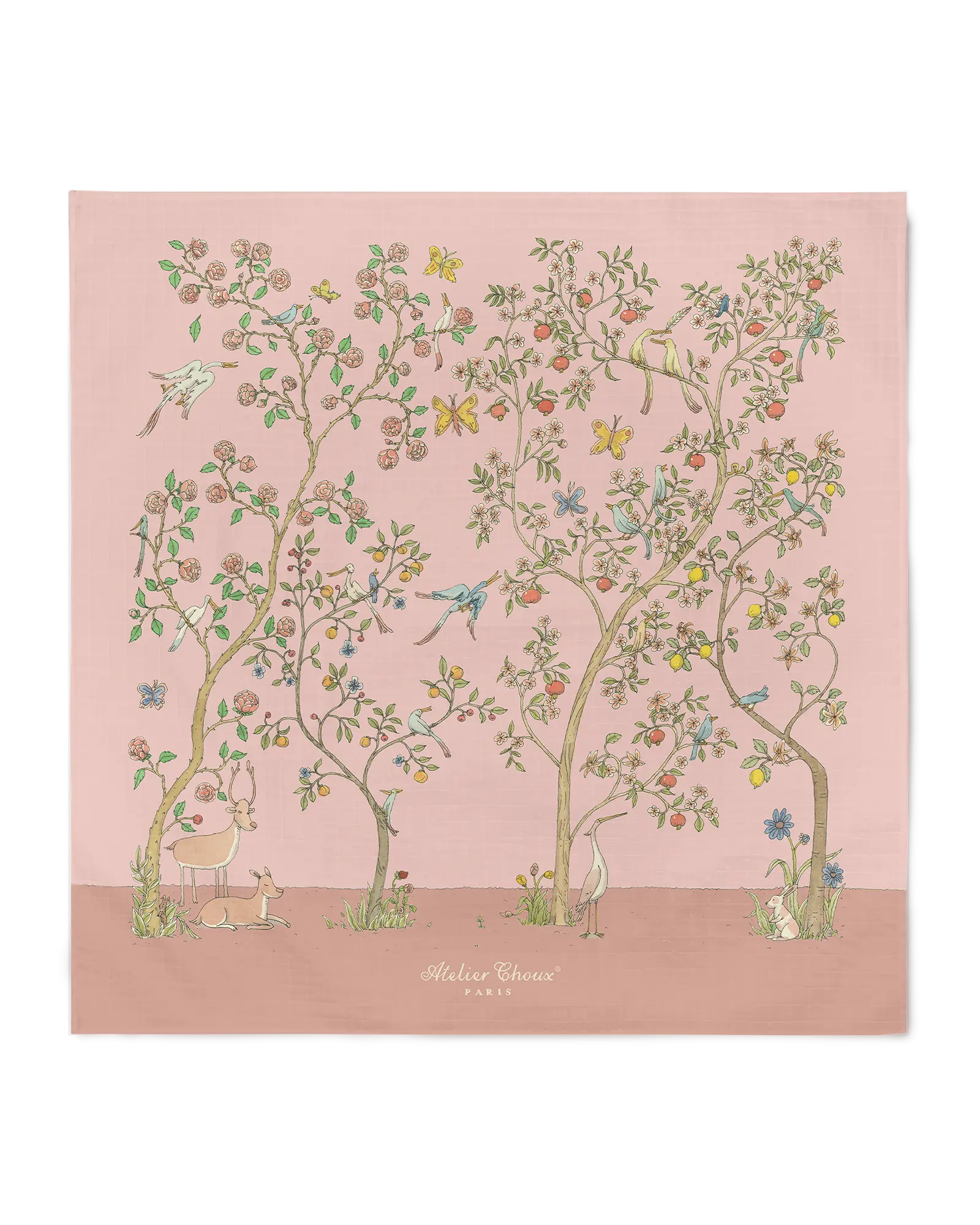 The Atelier Choux Carré & Bib Set – In Bloom Pink is a refined gift set featuring our iconic Carré and matching satin bib in a delicate floral and fauna print. With its tranquil garden scene of blooming trees, colorful birds, butterflies, and gentle woodland animals, this set offers a poetic blend of elegance and everyday practicality for newborns.