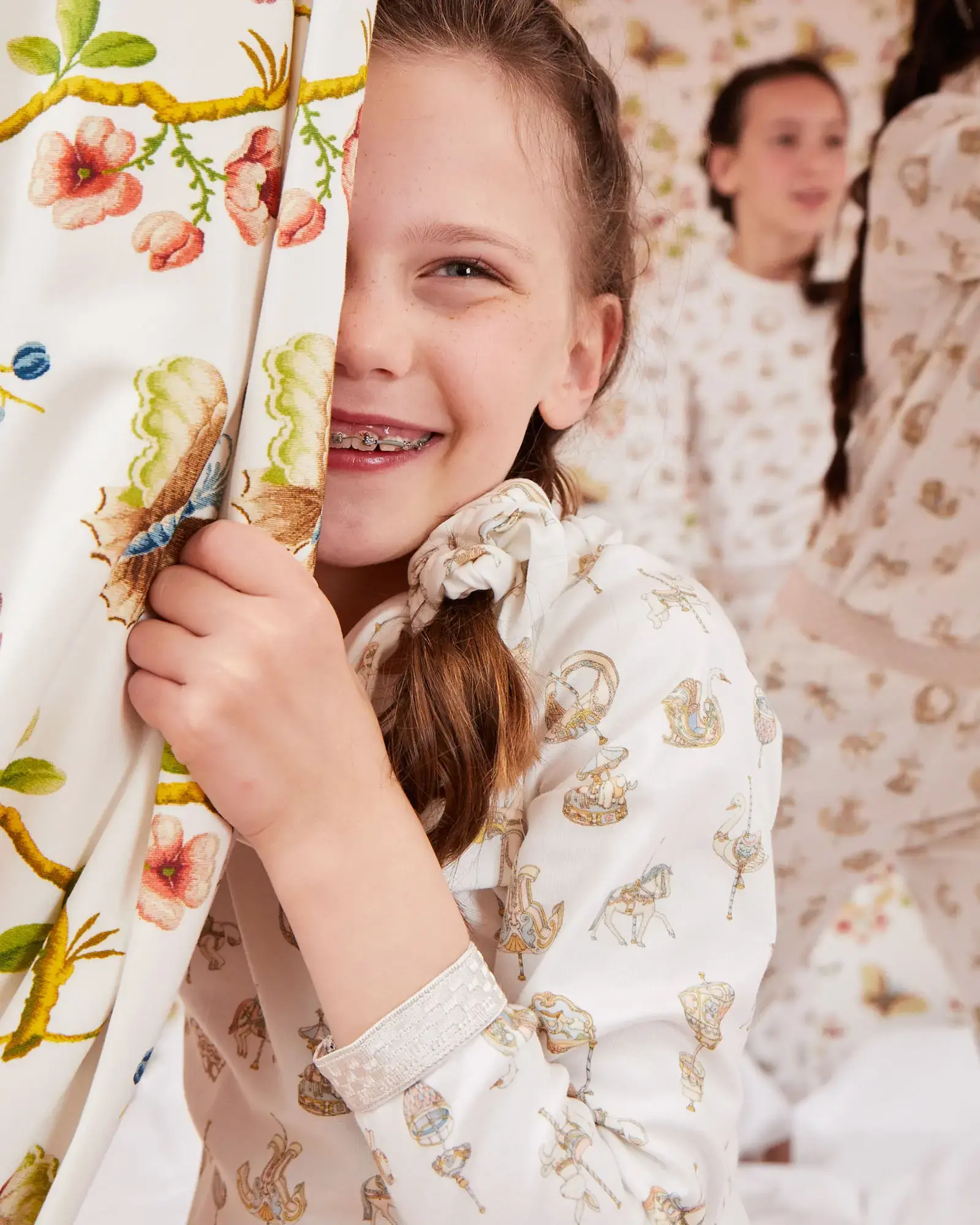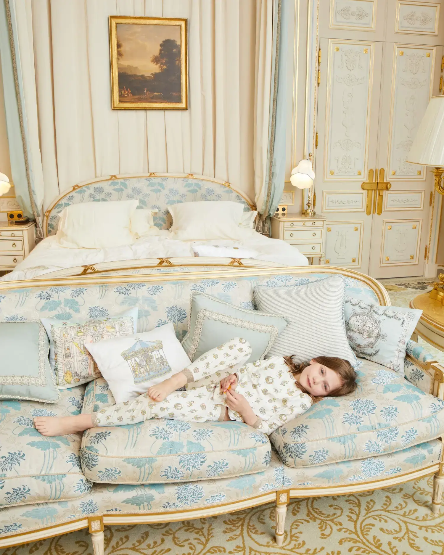 Our signature, gender-neutral print—inspired by the enchanting carousels of France—adorns this luxurious cotton Loungewear Set, with a golden elastic trim.