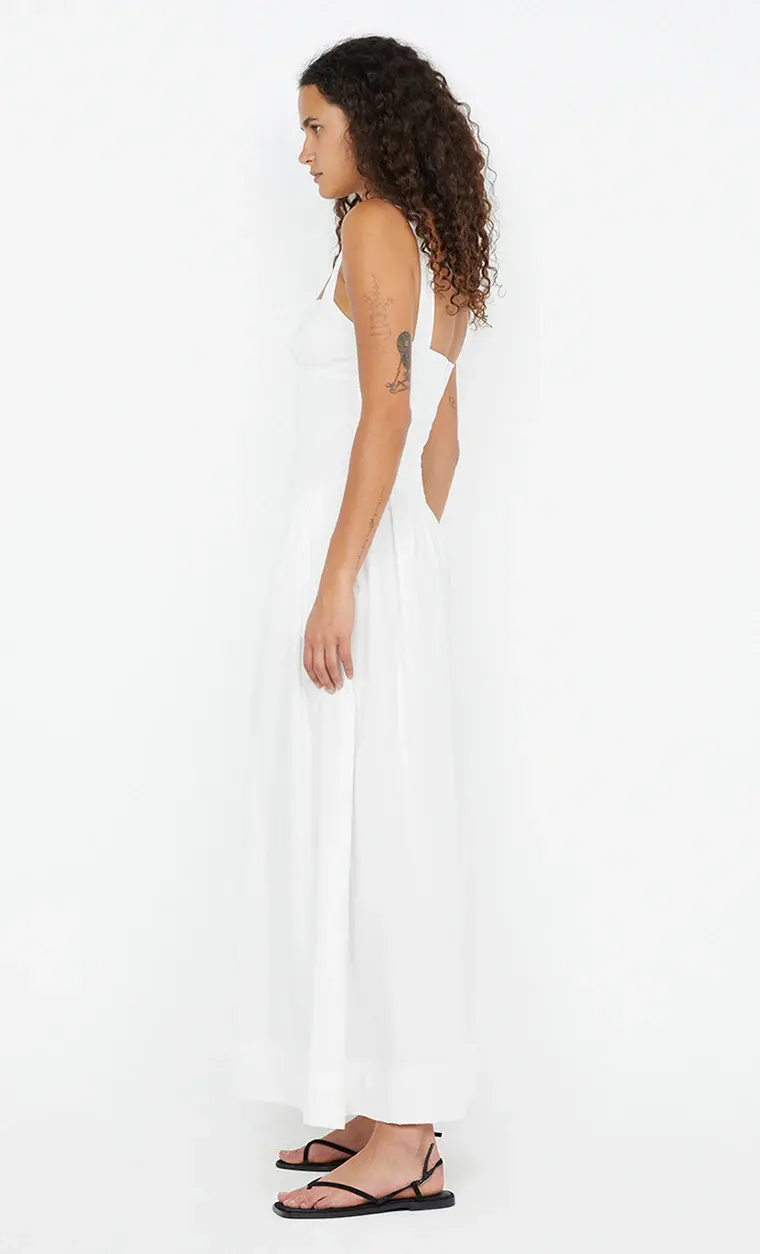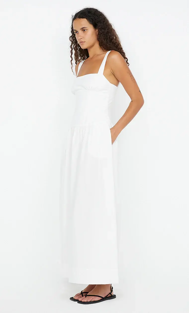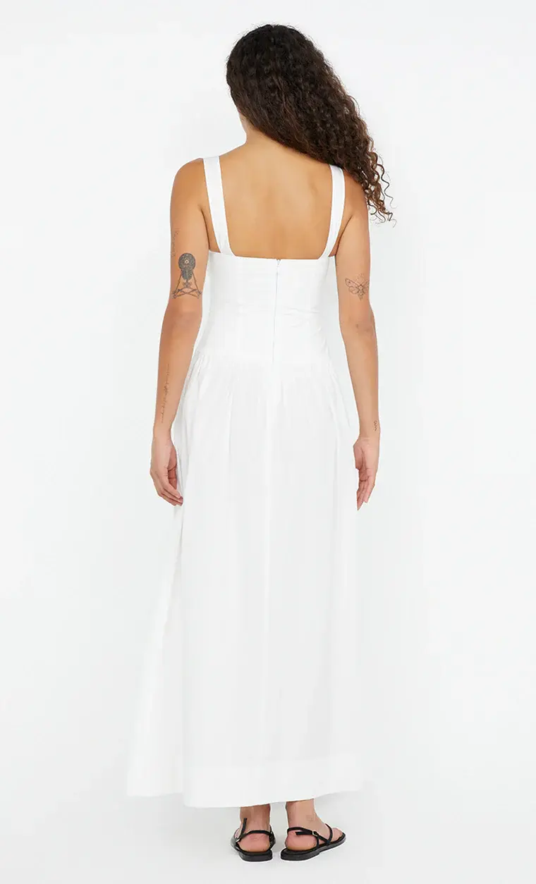 The BEC + BRIDGE Dune Maxi Dress in White is a beautifully structured maxi dress cut from cotton poplin. It features a square neckline and under bust seam with soft gathers for added shape. The bodice is designed to fit snugly, flowing into a gathered skirt for a flattering silhouette. Finished with an invisible zip at the back and a wide turned-up hem with a single topstitch.
