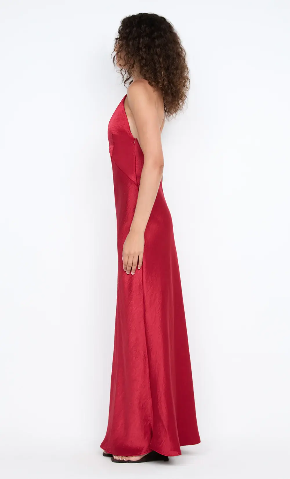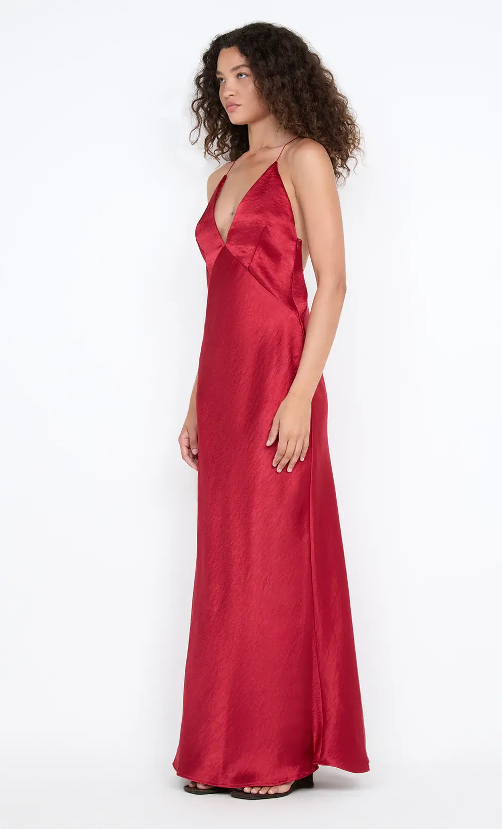 Ariahn Maxi Dress in Cherry. This elegant bias-cut maxi dress features a low plunge V-neckline and a striking open back, creating a timeless silhouette perfect for a night out or elevated holiday styling.