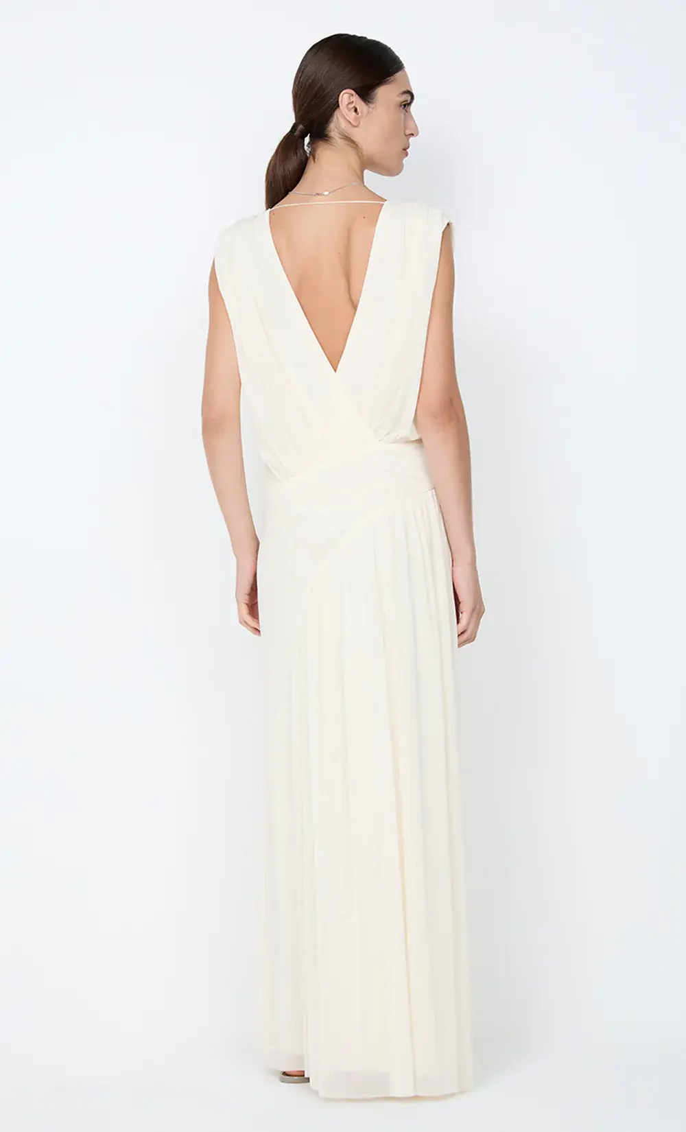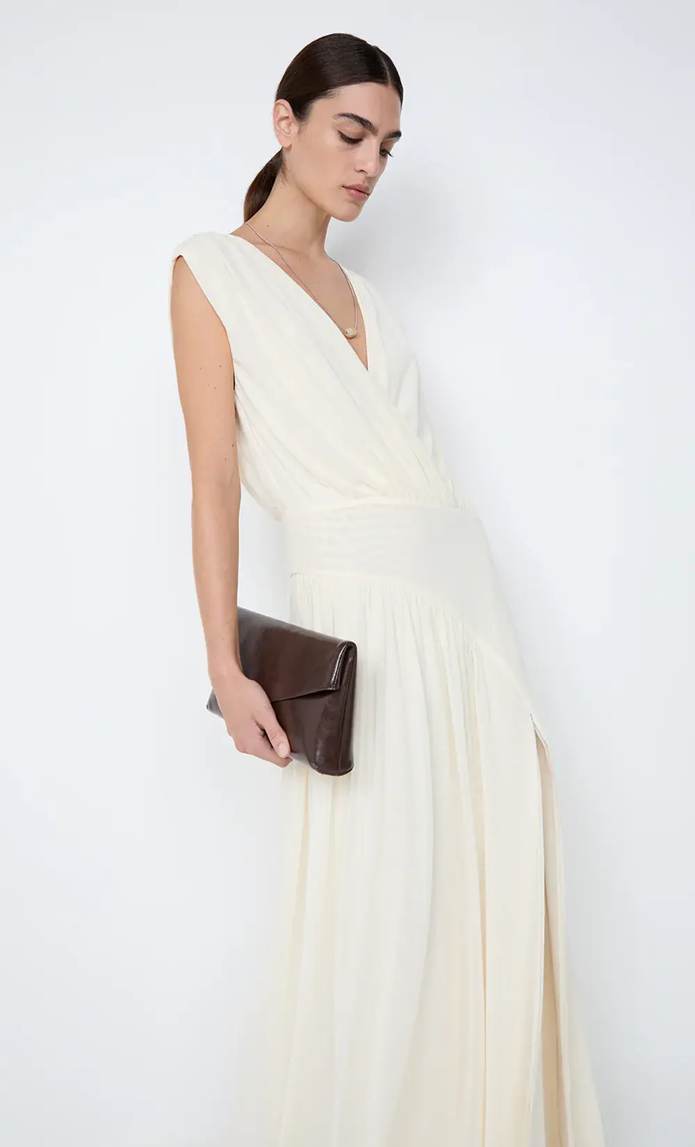 Ashlan V Neck Maxi Dress in Buttercream. This stunning maxi dress features a statement leg split and an elegant silhouette, perfect for a luxurious evening or holiday event.