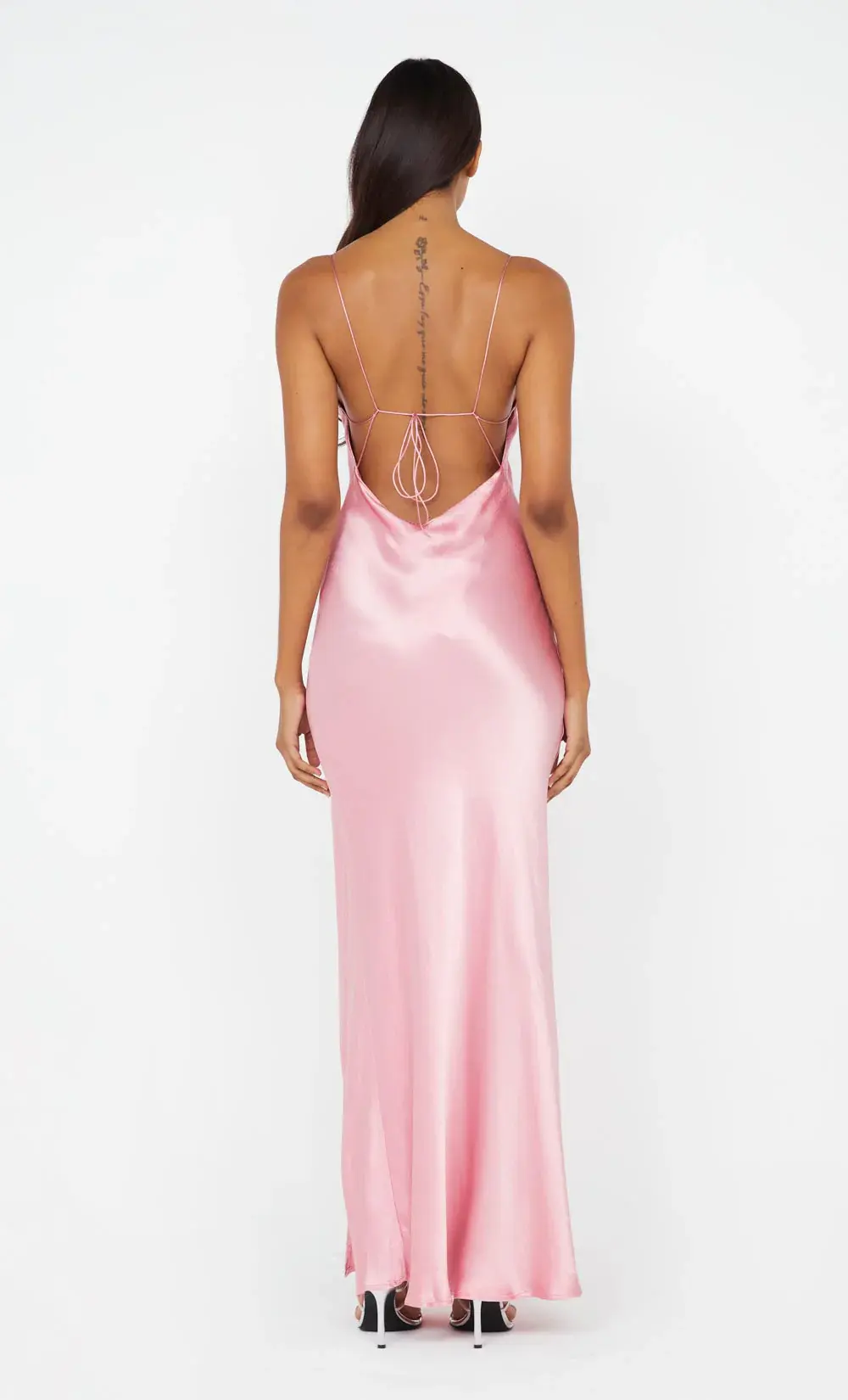 The BEC + BRIDGE Ayala Cowl Maxi Dress is cut on the bias and features a cowl neckline, mid thigh leg split and thin cord shoulder straps that tie at a statement open cowl back.