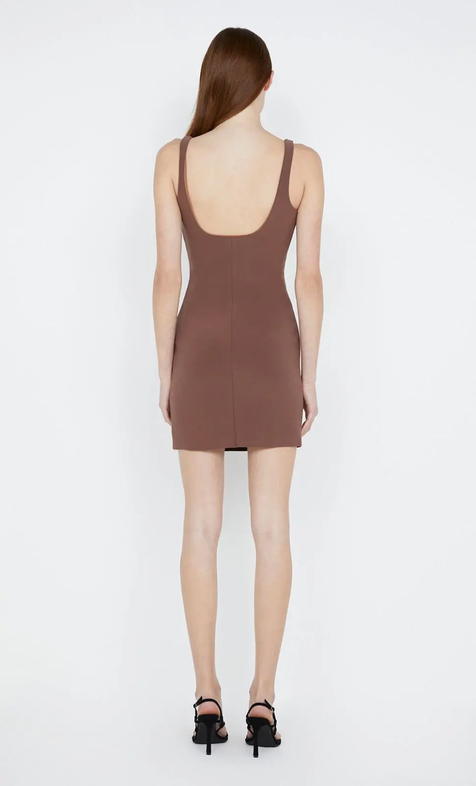 Bec & Bridge stretch-crepe dress. Square neck, pleated gathered details at side, low back, fully lined. Slips on.