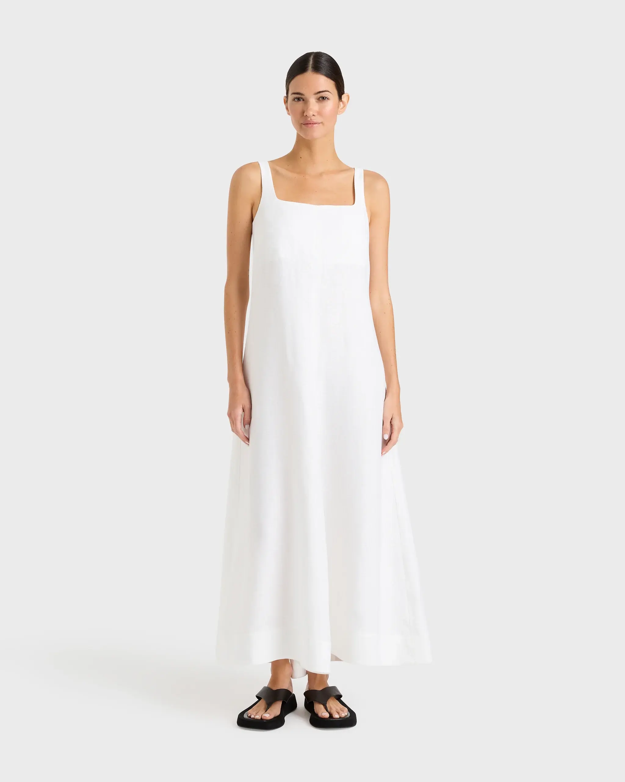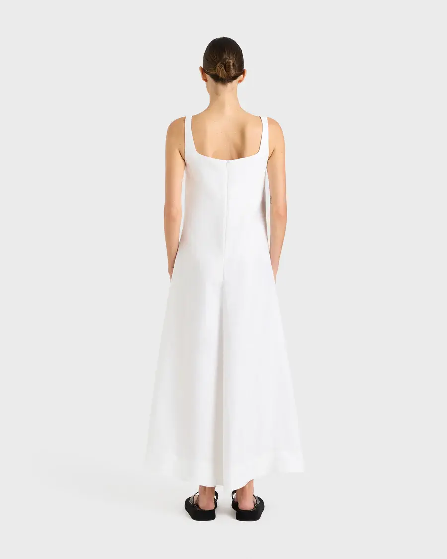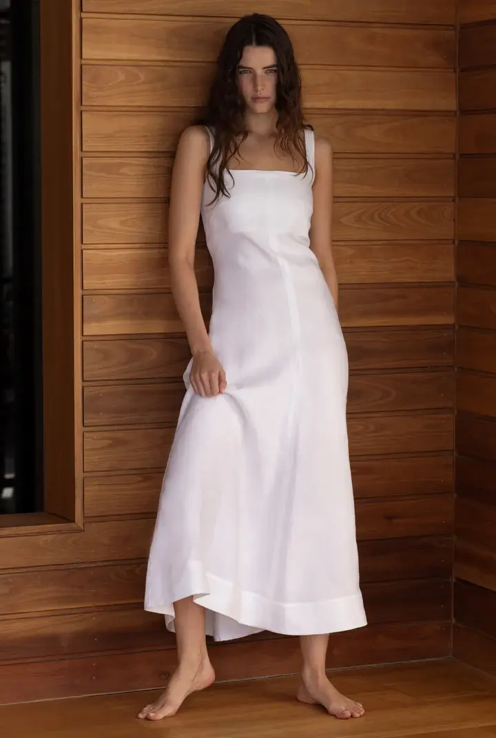 The Delphi flared Maxi Dress in white is cut from a luxury 100% organic linen that has been milled by a Masters or Linen. This classic, minimal dress has a contemporary square neckline. The mid-weight structured linen provides volume that flares to the ankles. Never going out of style, this dress is perfect for elevated day dressing and events.