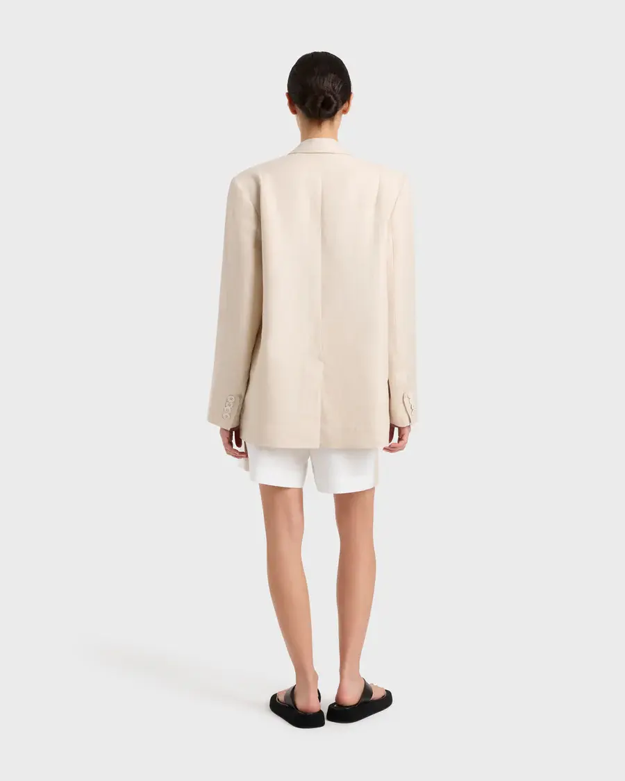 The Delphi Linen Oversize Blazer in Sand is a relaxed tailored jacket, cut from a luxury 100% organic linen that has been milled by a Masters of Linen™ using European Flax. The jacket is self-lined at front and features welt pockets, Japanese buttoning at centre front and cuffs and a vent at centre back. Endlessly versatile, this effortless jacket teams perfectly with our Delphi Linen Two Tone Pant in White and Sand and the Delphi Linen Two Tone Short in White and Sand.
