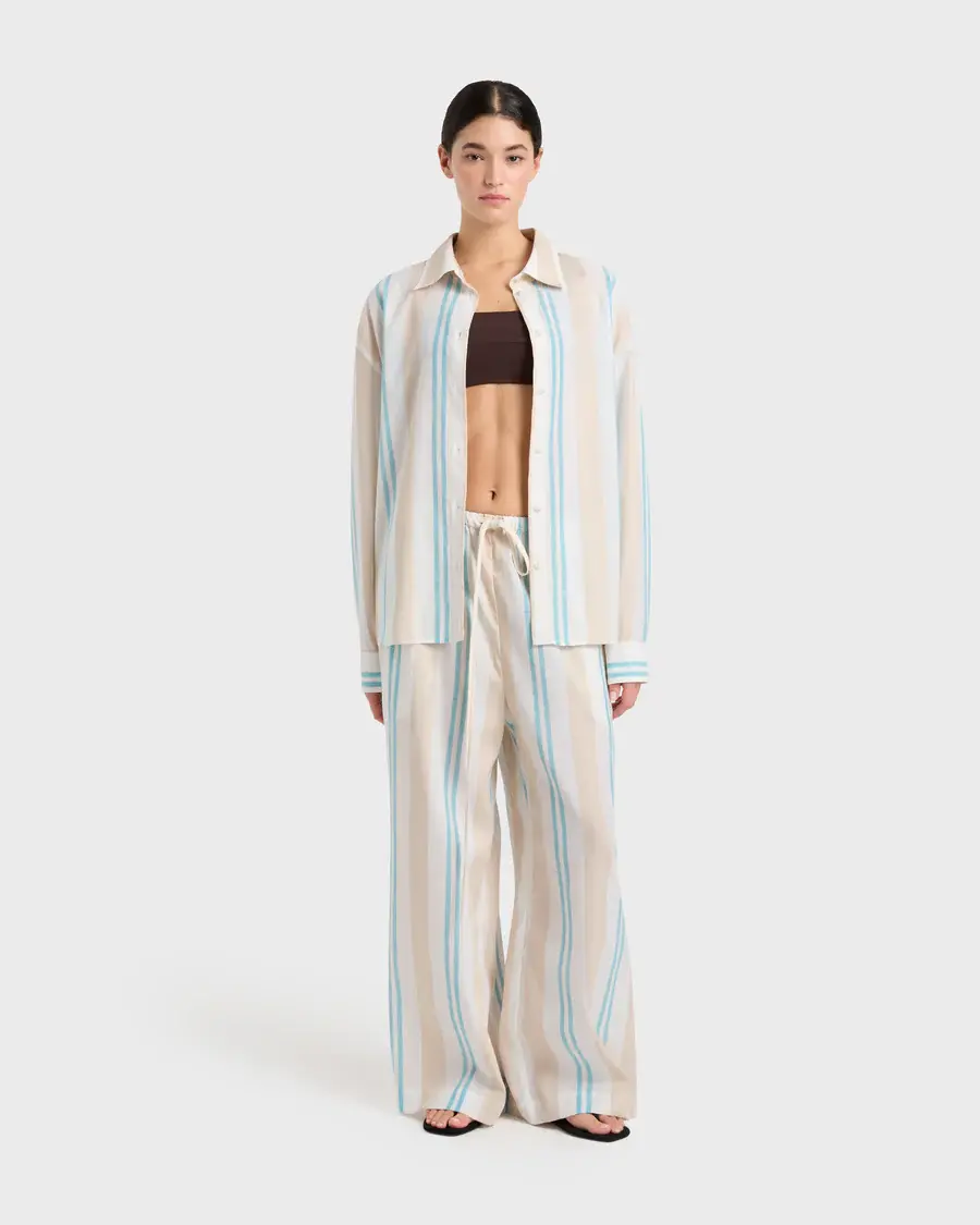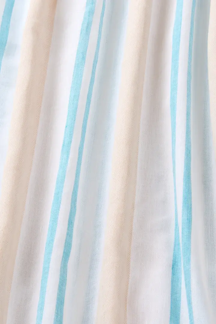 The Arezzo Classic Shirt in Dune stripe is cut from a light, cool blend of BCI Organic Cotton and European Flax, milled by a Masters or Linen™. This summery shirt pairs perfectly with the Arezzo Boxer Short, Arezzo Drawstring pant, or white linen pants. The long sleeve shirt features drop shoulders and buttoned cuffs.