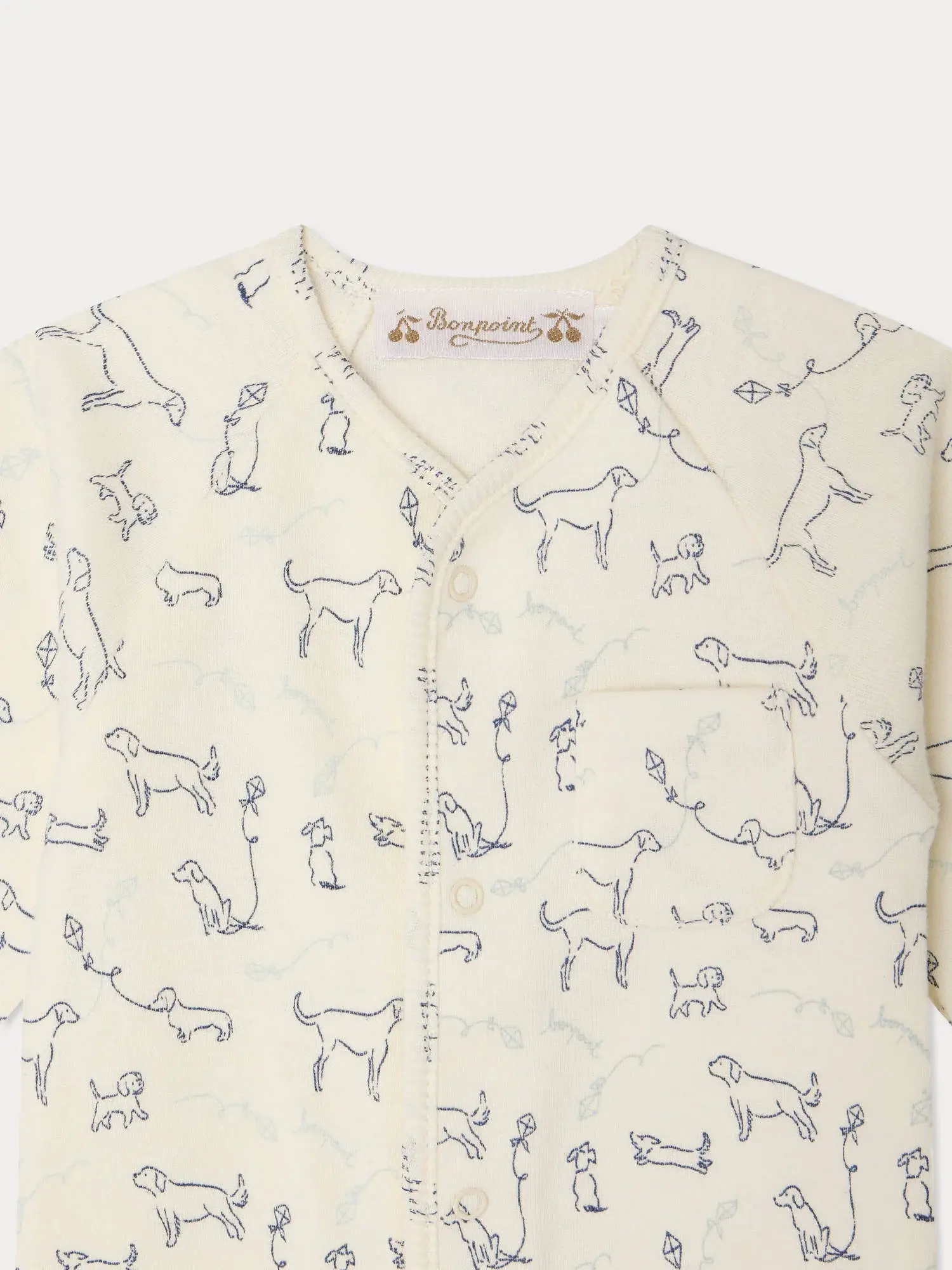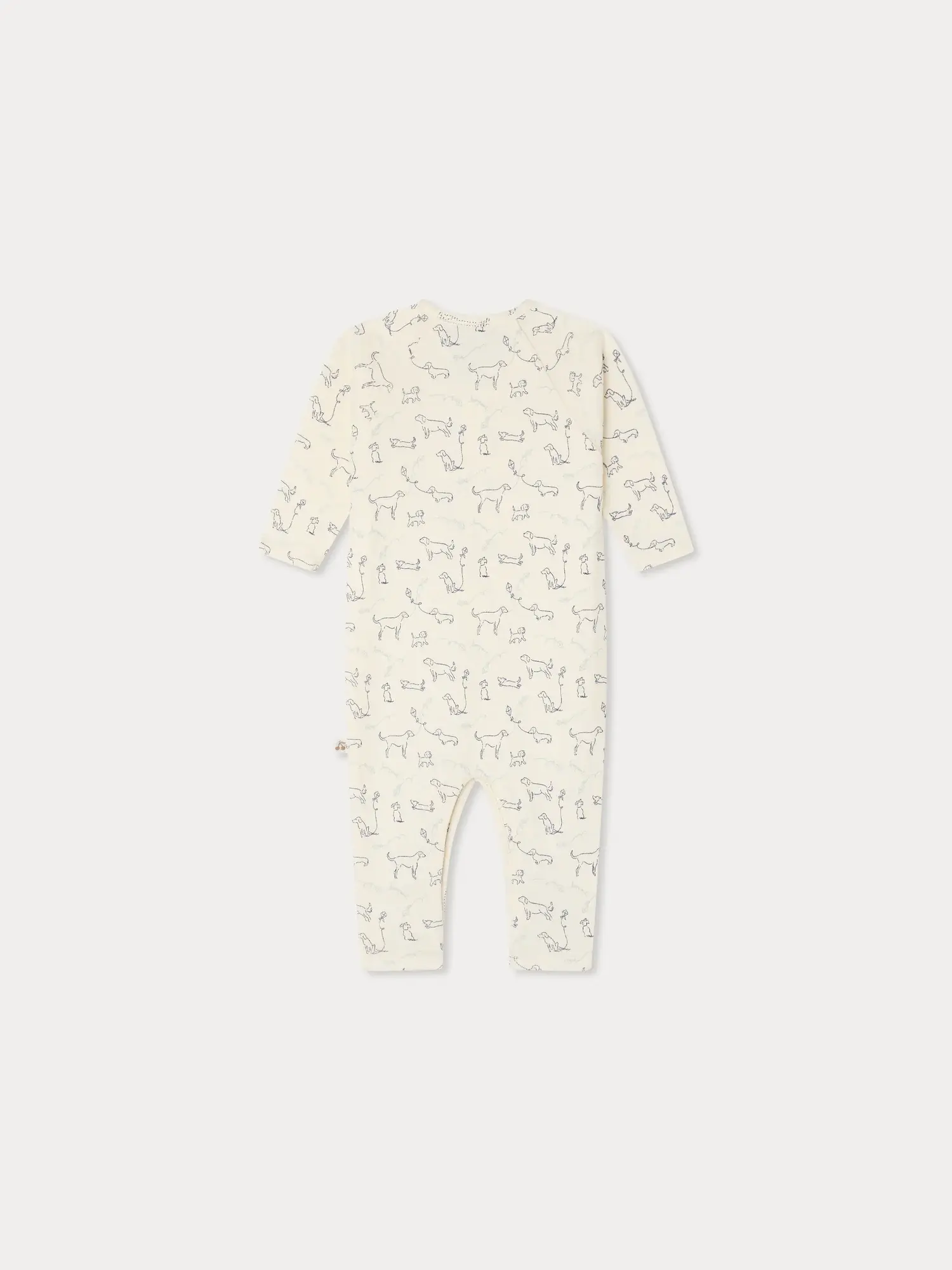 These organic cotton Georget pajamas for babies feature a distinctive allover dog print. A button fastening at the front and along the inseam make them easy to slip on and off.