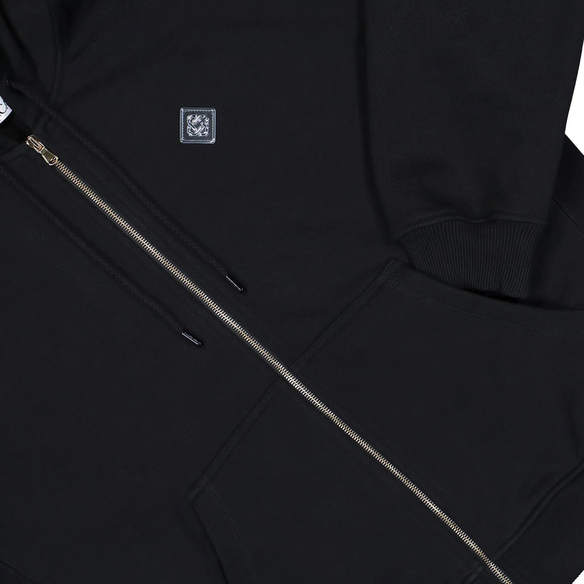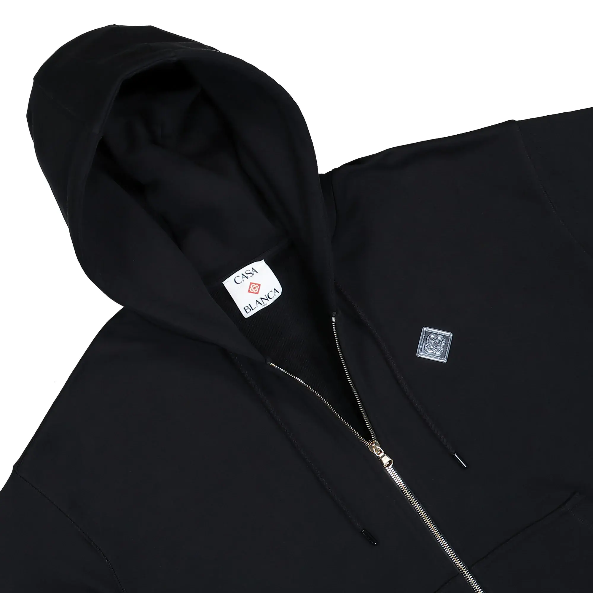 The Casa Chrome Full Zip Hoodie from Casablanca combines premium cotton comfort with a sleek black design. Featuring a full-length zipper for adjustable wear, it showcases the iconic Casablanca lettering boldly on the back and a subtle logo on the chest. This hoodie offers both style and versatility, making it a refined choice for those seeking understated luxury and everyday functionality.