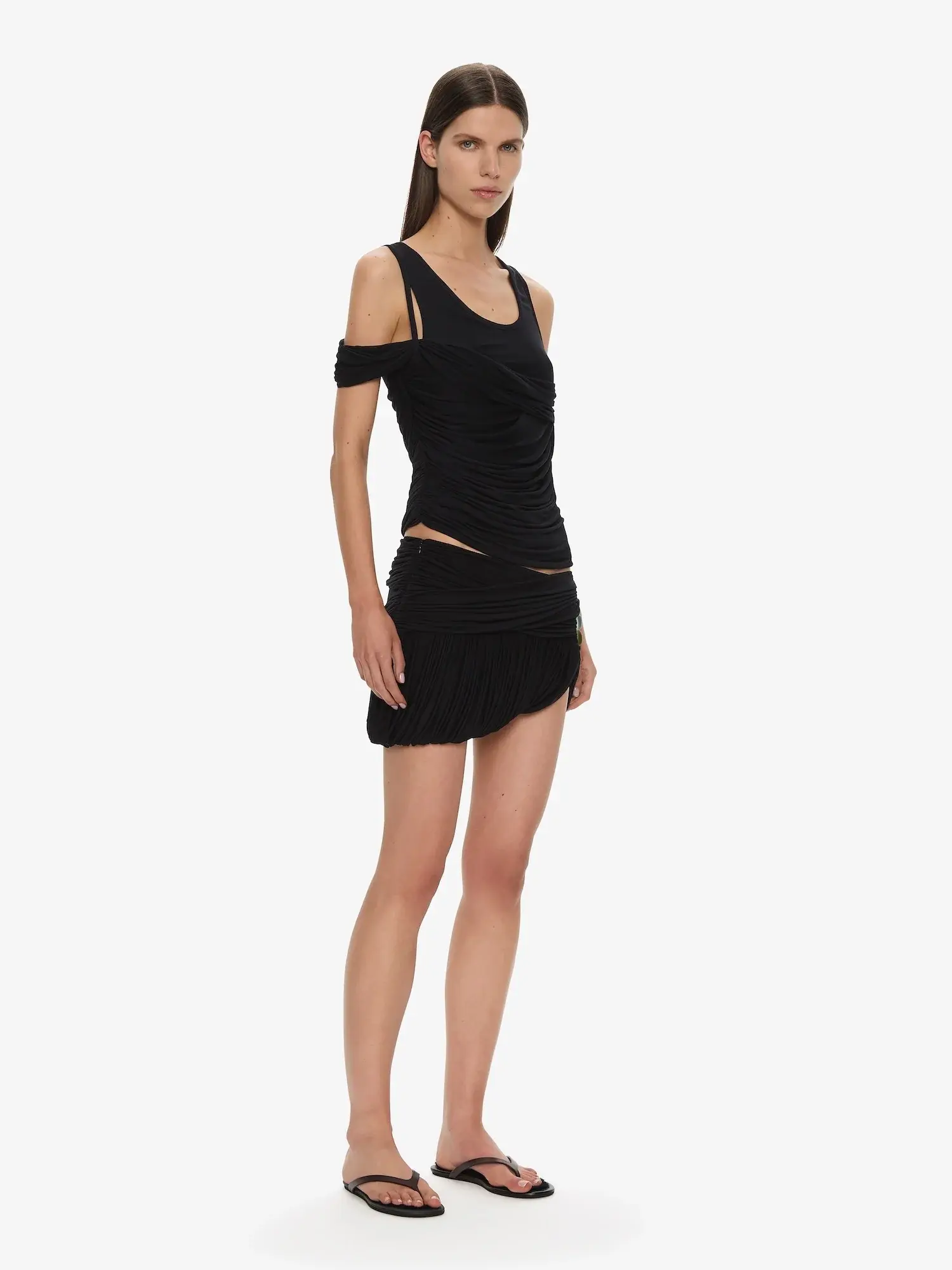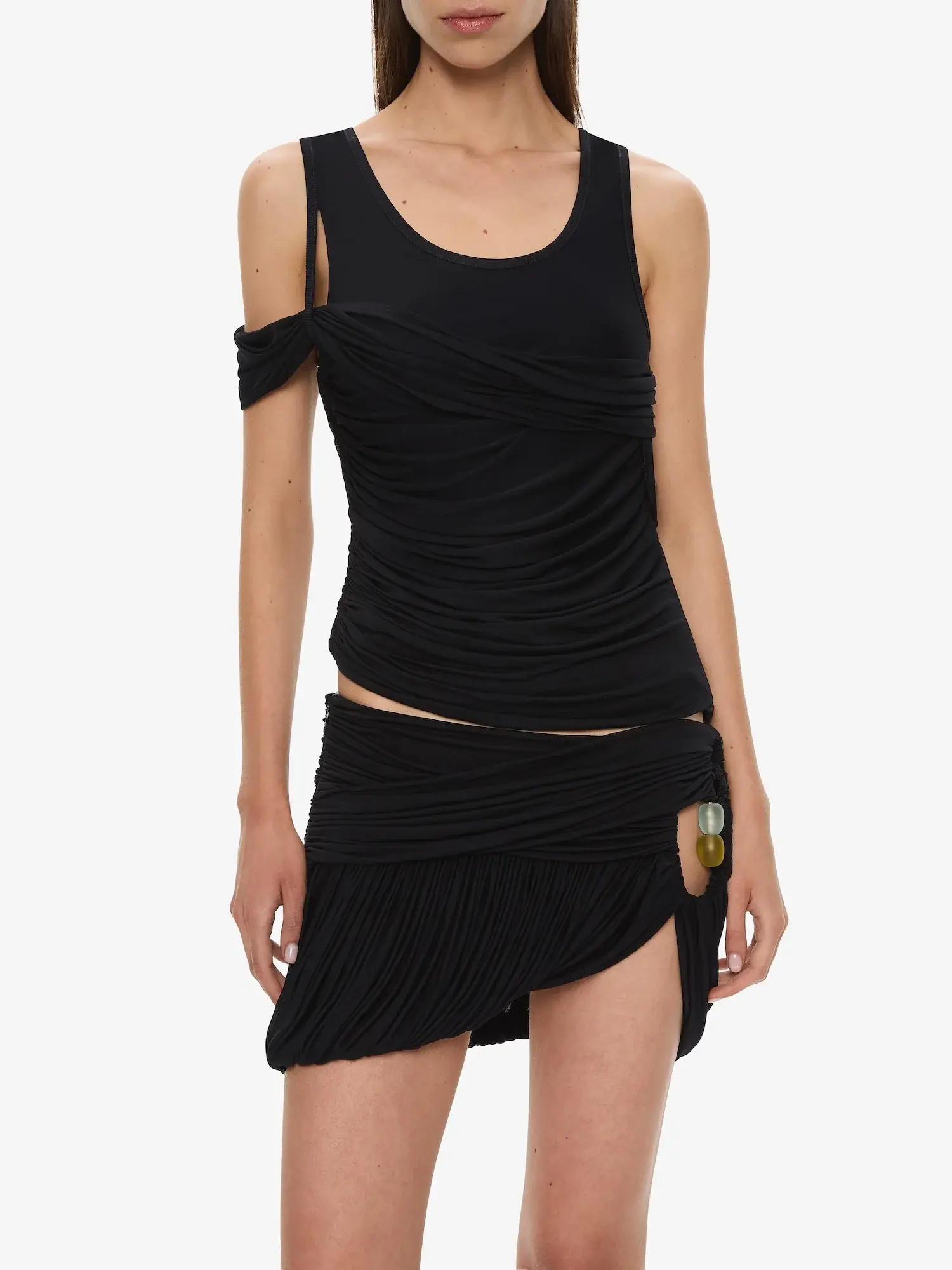 Gathered and asymmetrical, cut in stretch jersey and finished with sheer, hand-cast resin droplets at the hip. Designed to sit low on the waist, the ruched silhouette is anchored by soft pleating through the hem. Style with the coordinating tank or layer with swim.