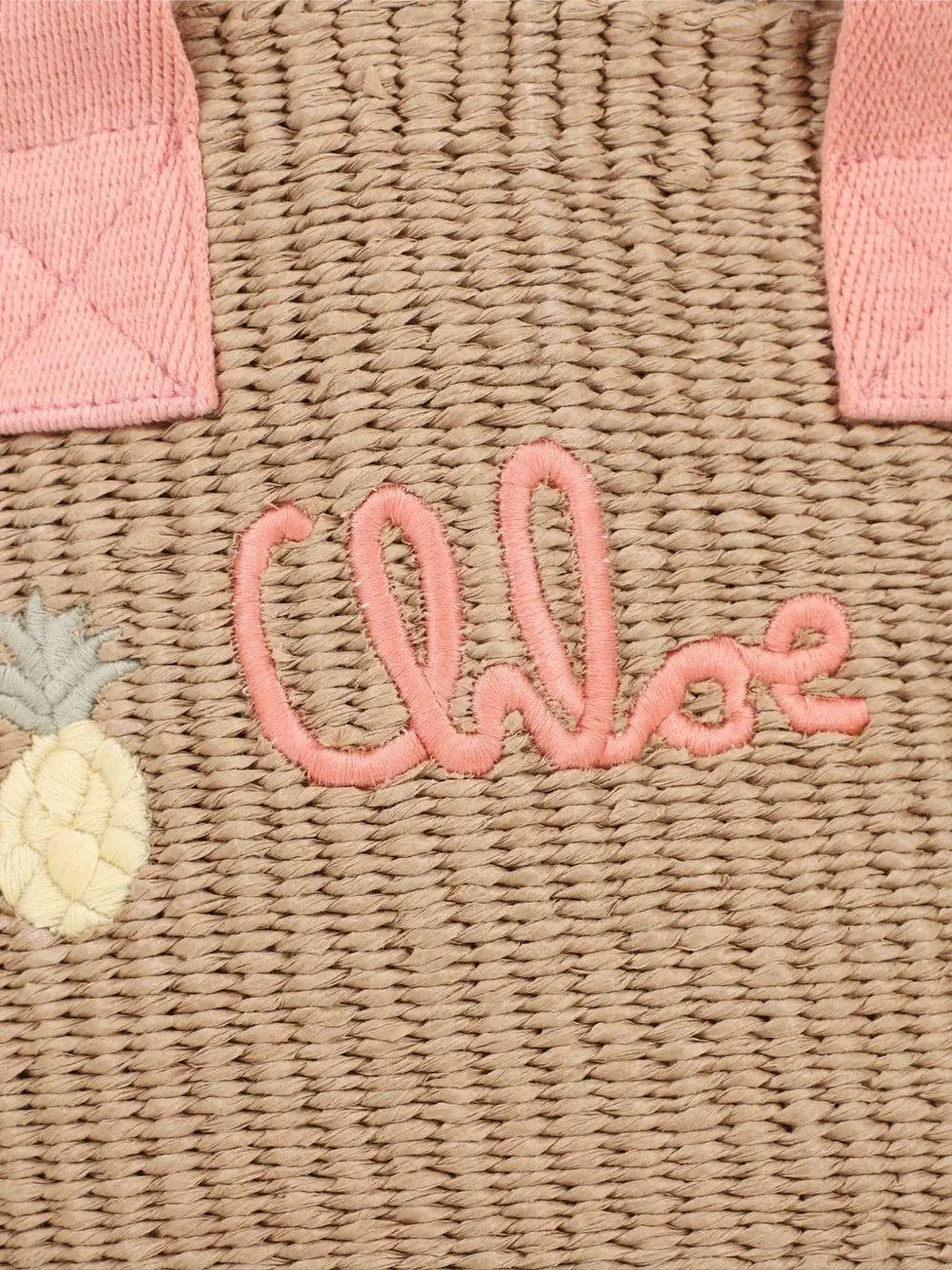 The Chloé Kids Lou beige tote bag for girls with embroidered logo. Made of 100% polyester, it features a beige color, pineapple decoration, a lettered logo, and two handles.