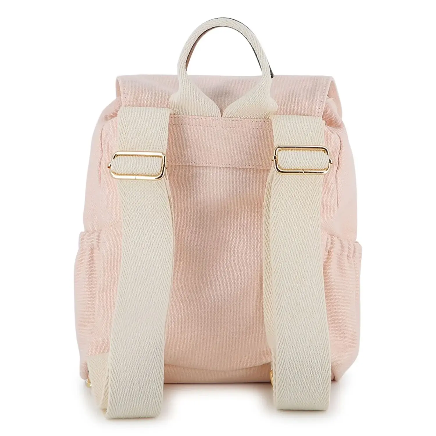Pink canvas backpack for girls by Chloé. Crafted from lightly textured canvas, it features a spacious main compartment with a drawstring closure and two side pockets for extra storage. A top handle and adjustable shoulder straps ensure comfortable carrying, while a gold embroidered logo and gold tone charm provide a subtle designer detail.