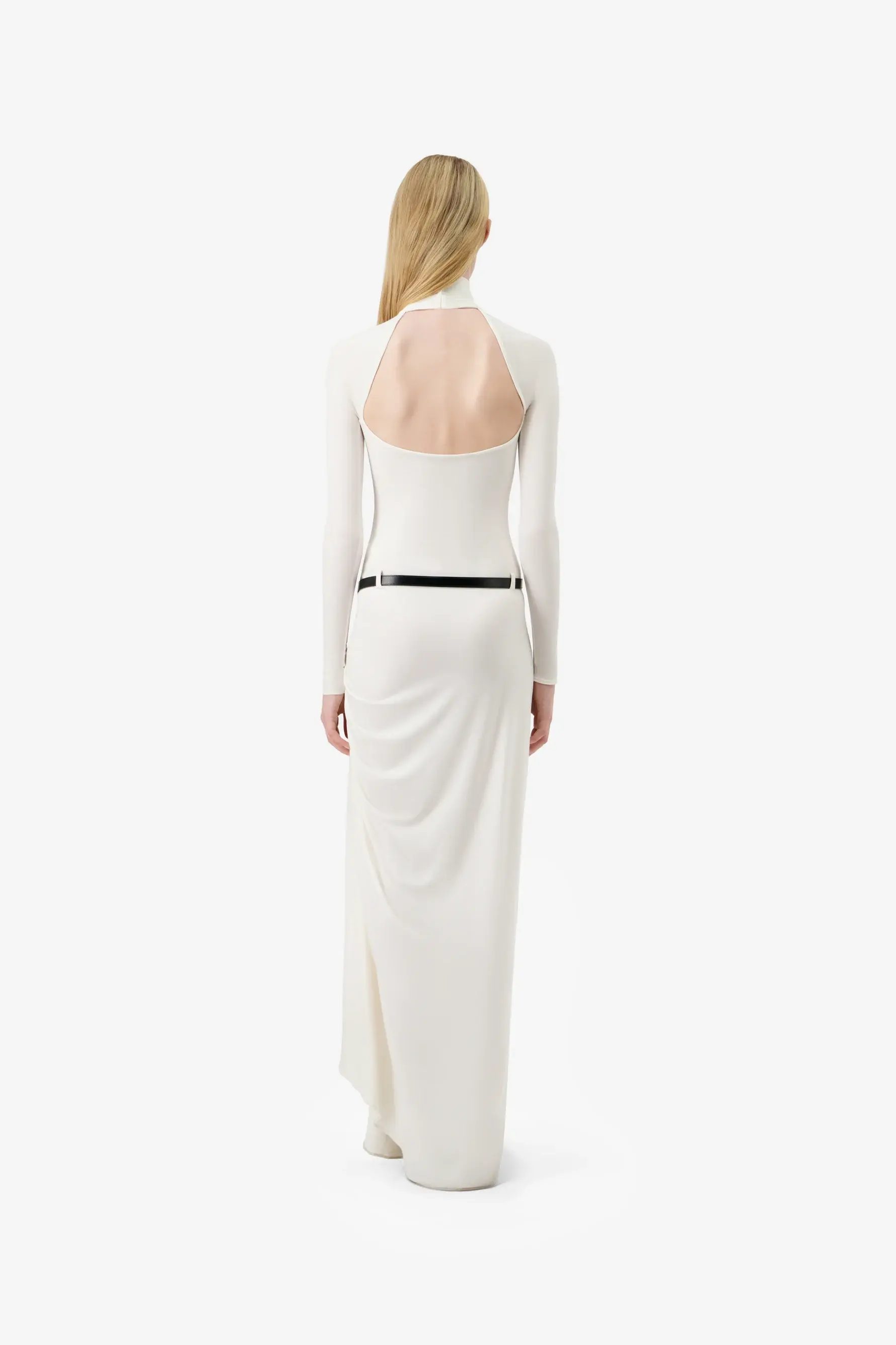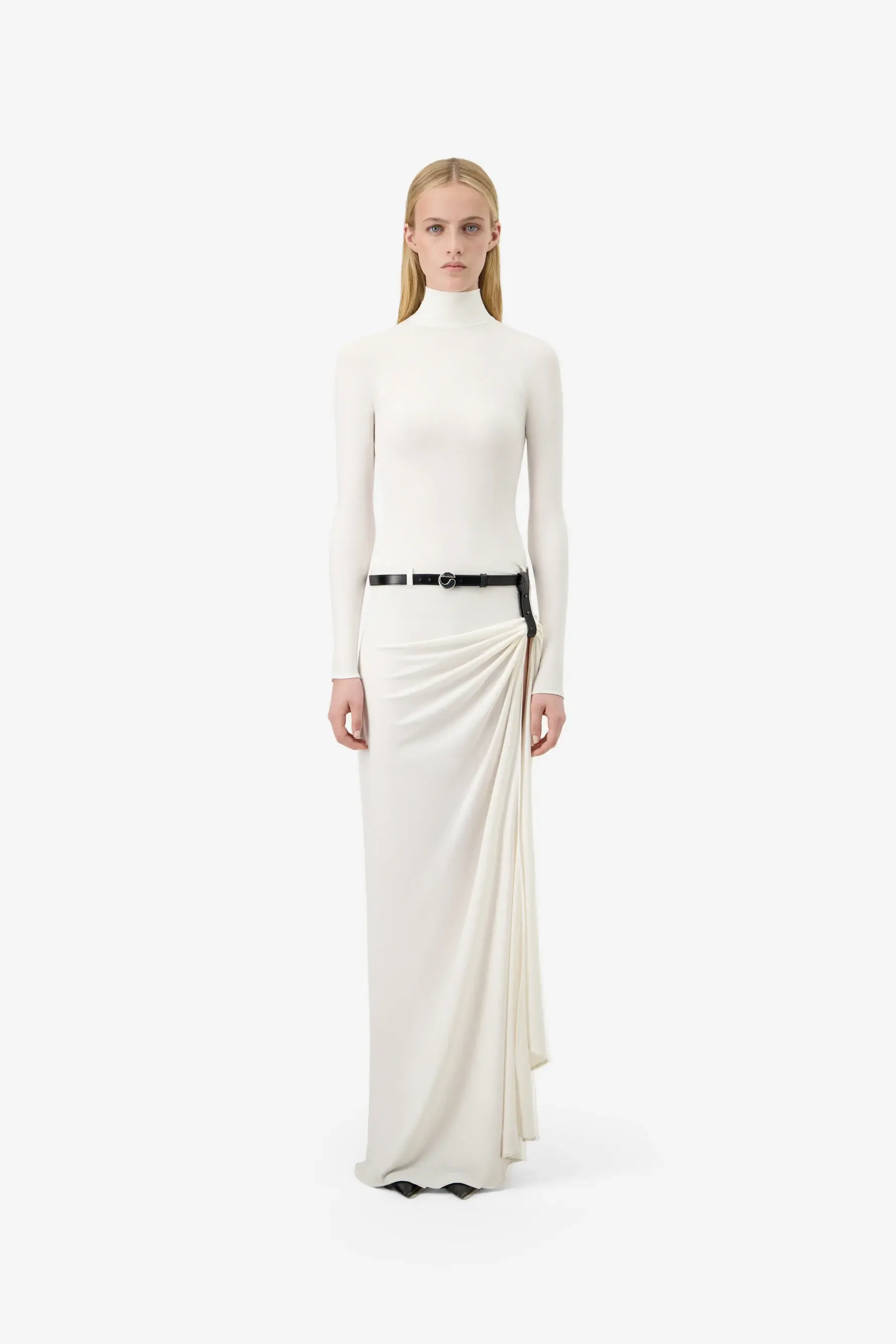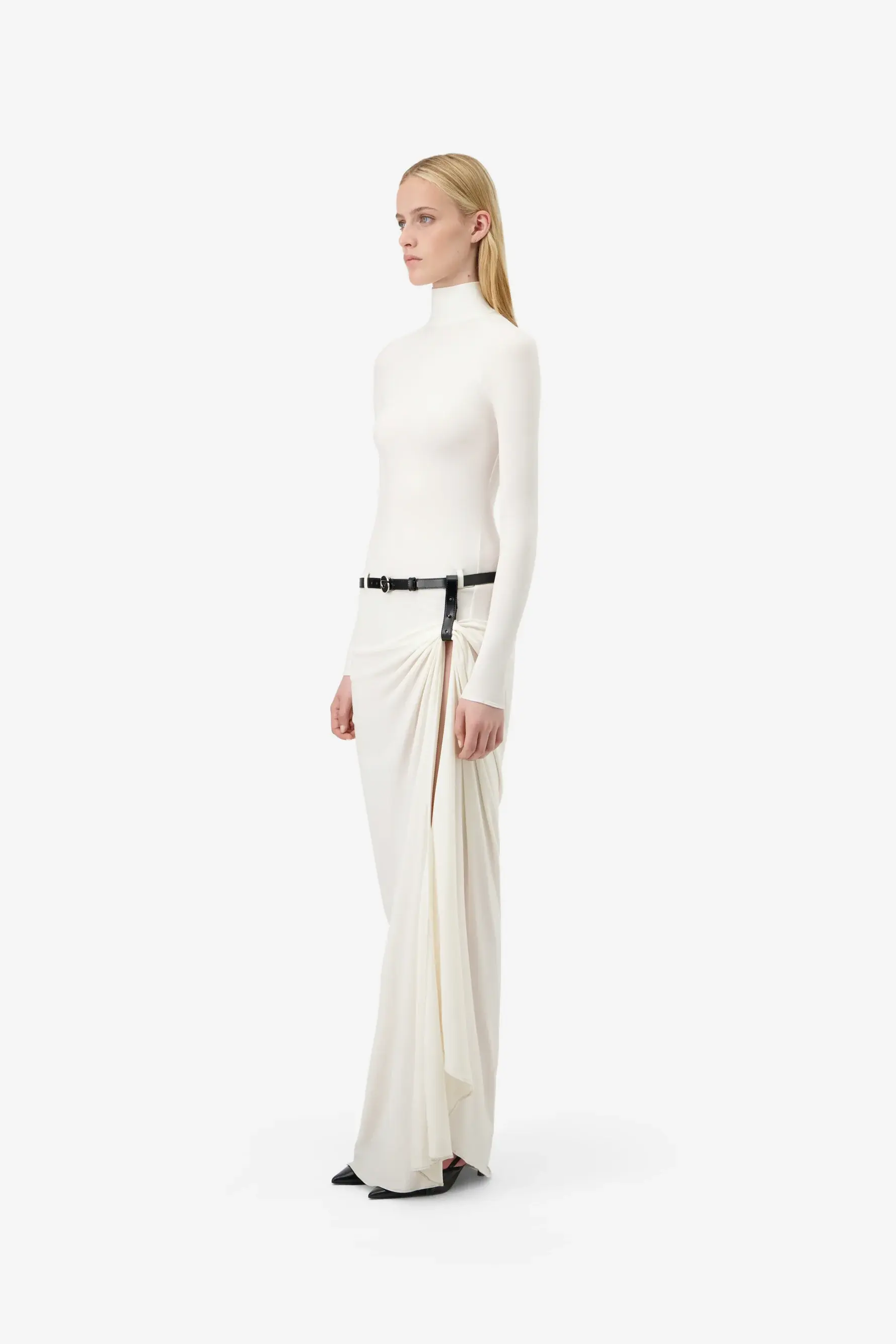 Rendered in optic white, this floor-length gown wraps the body with precision. A sculptural gathering at the hip and high side slit break the clean silhouette, while a low-waisted black belt interrupts the softness.