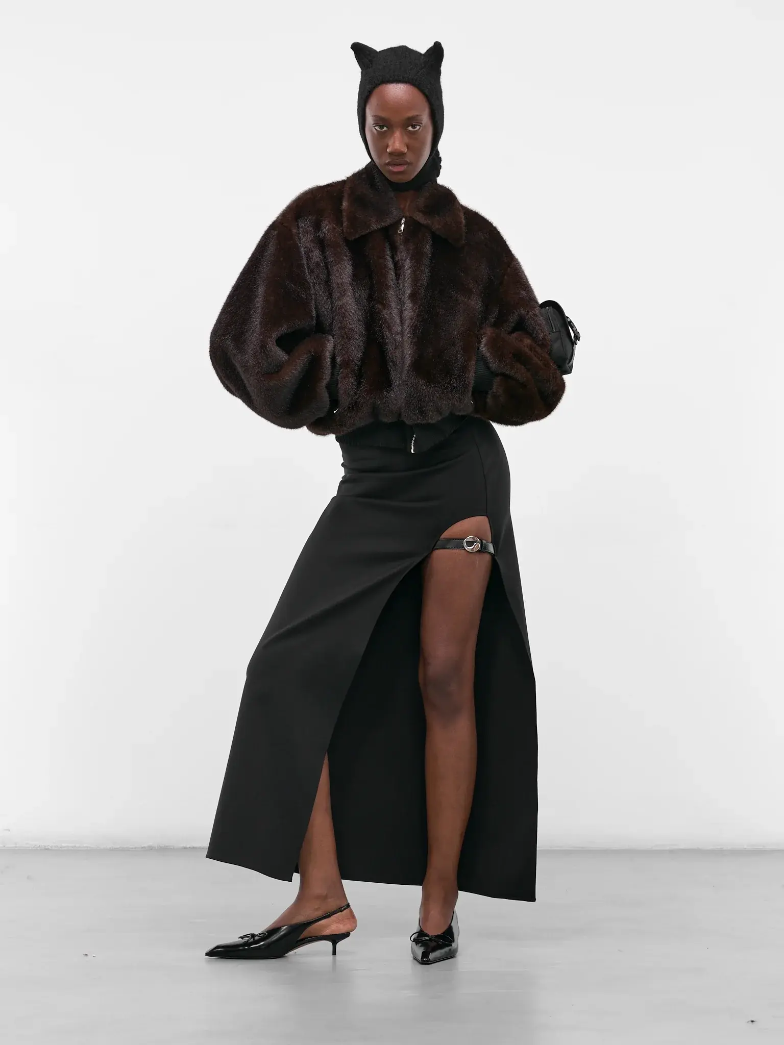 A brown faux fur bomber jacket crafted from recycled polyester with sculptural cocoon sleeves. Finished with rib-knit trims, a spread collar, and a tonal logo patch at the arm pocket.