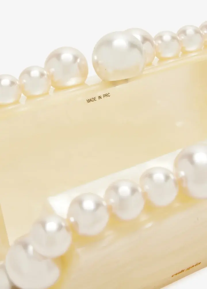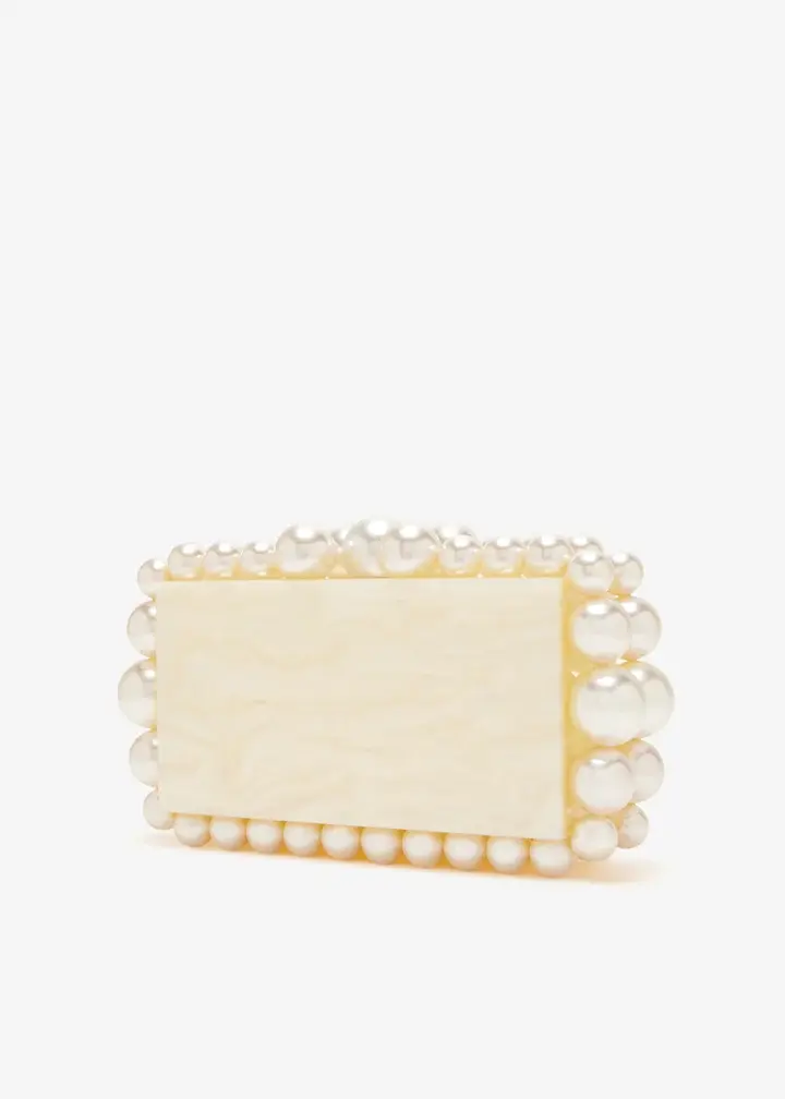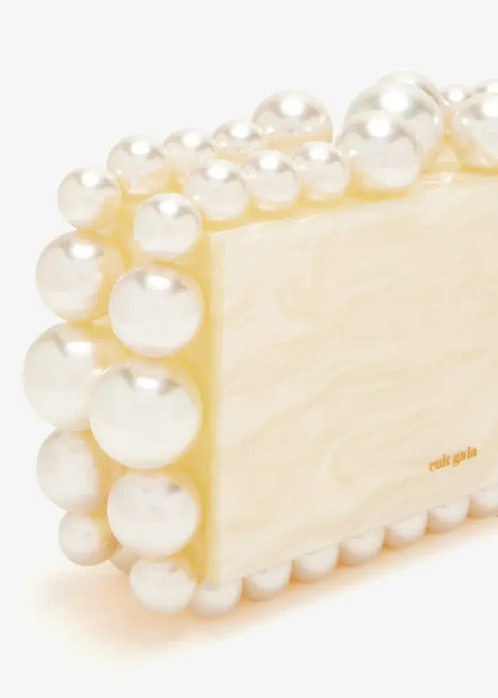 The signature acrylic box shaped clutch with coordinating beads surrounding the edges now in our antique brass.