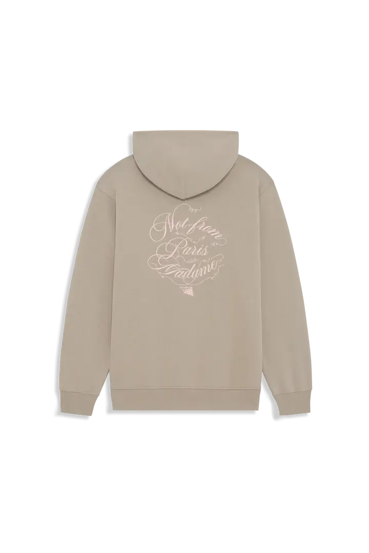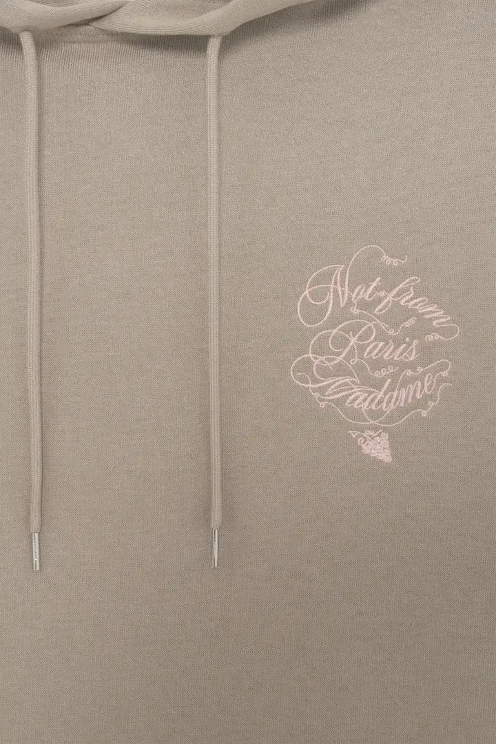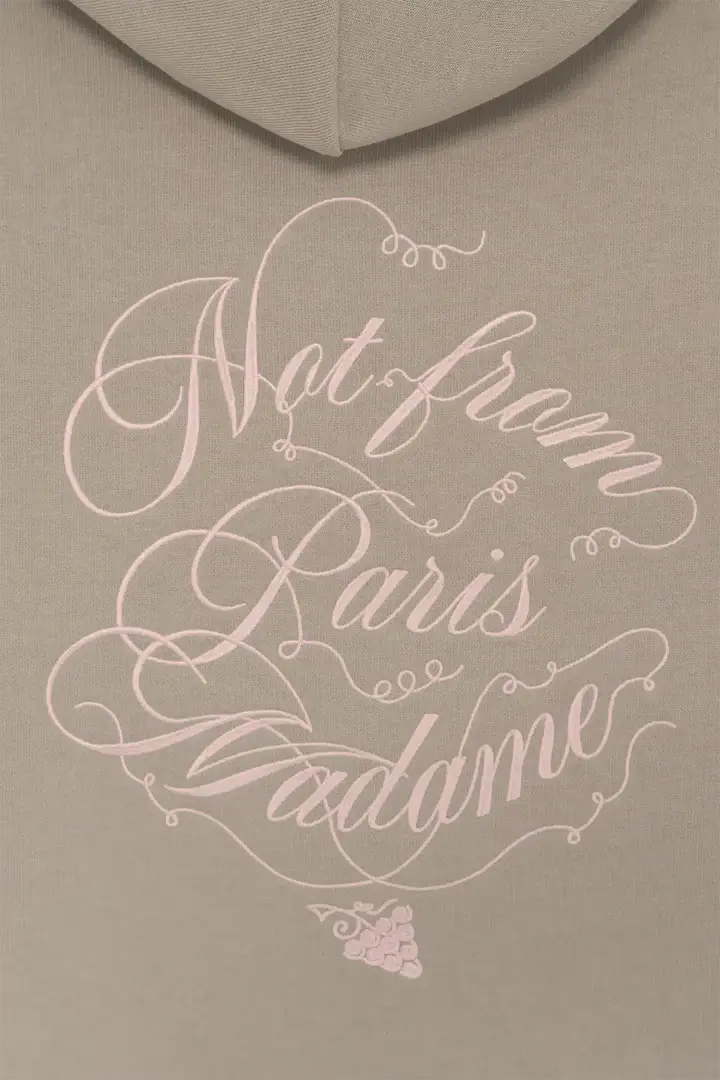 This beige 100% cotton French terry hoodie is embroidered with the Slogan Vignes pattern on the front and back. It has a drawstring hood with waxed tips, a kangaroo pocket and ribbed hem and cuffs.