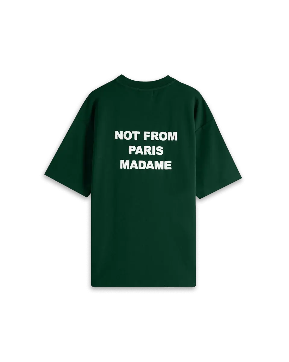 The Slogan tee. Made of 100% cotton interlock fabric, this black t-shirt features a ribbed neckline and the 'Not from Paris Madame' slogan printed front and back.