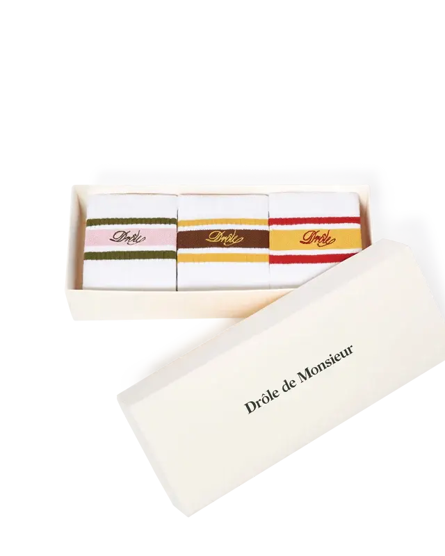 These calf-high stretch cotton-blend intarsia socks have a cushion footbed and feature the 'Drôle' logo. They come in a pack of three (red, yellow and green).