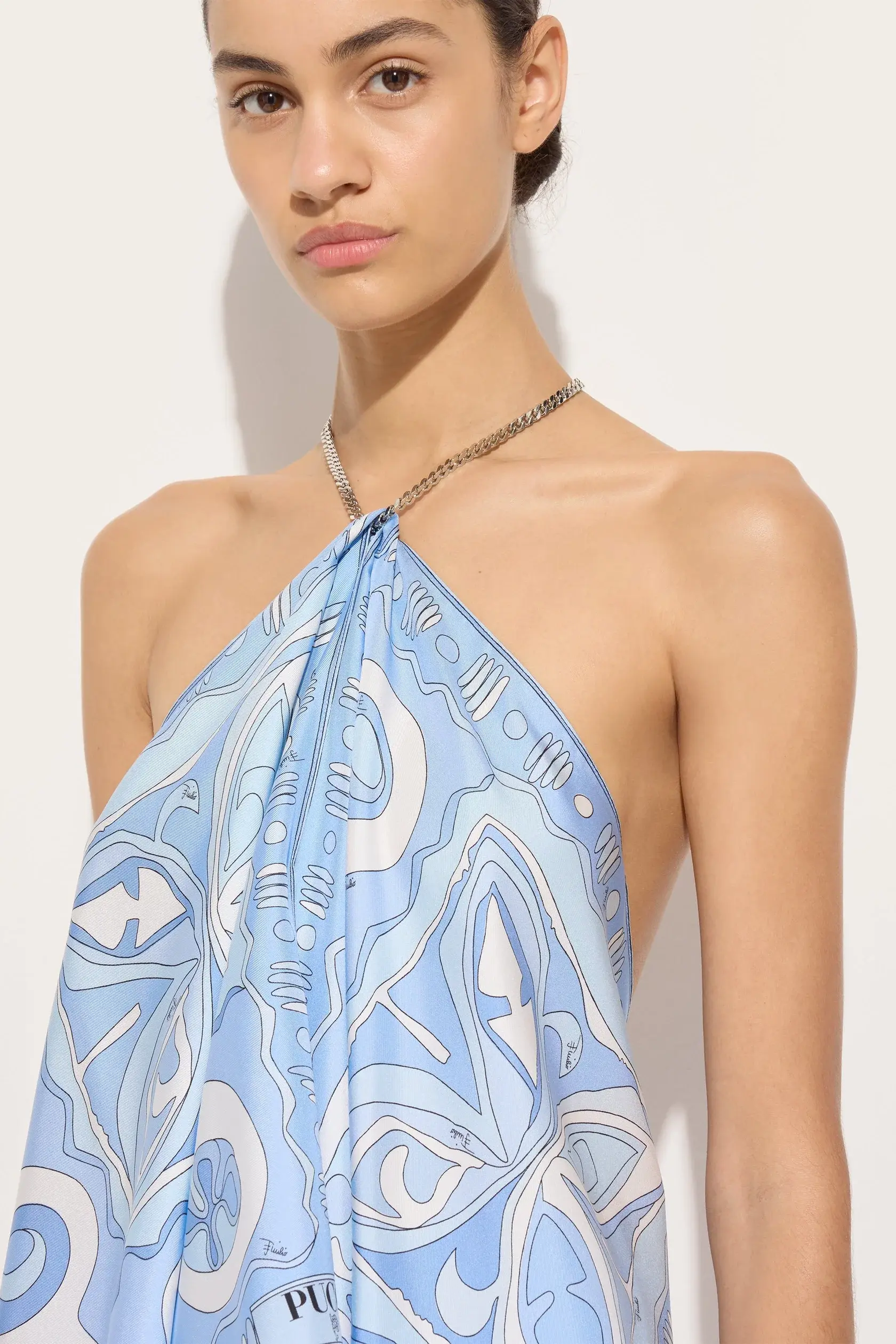 A light and sophisticated top that combines fluidity and jewel-like details. Made from silk twill, it glides over the body with natural elegance, while the chain detail at the neck adds a bright, bold accent, balanced by the mix of prints in pale blue, which enliven the surface with a delicate, harmonious rhythm. A garment designed to enhance movement with refinement and personality.