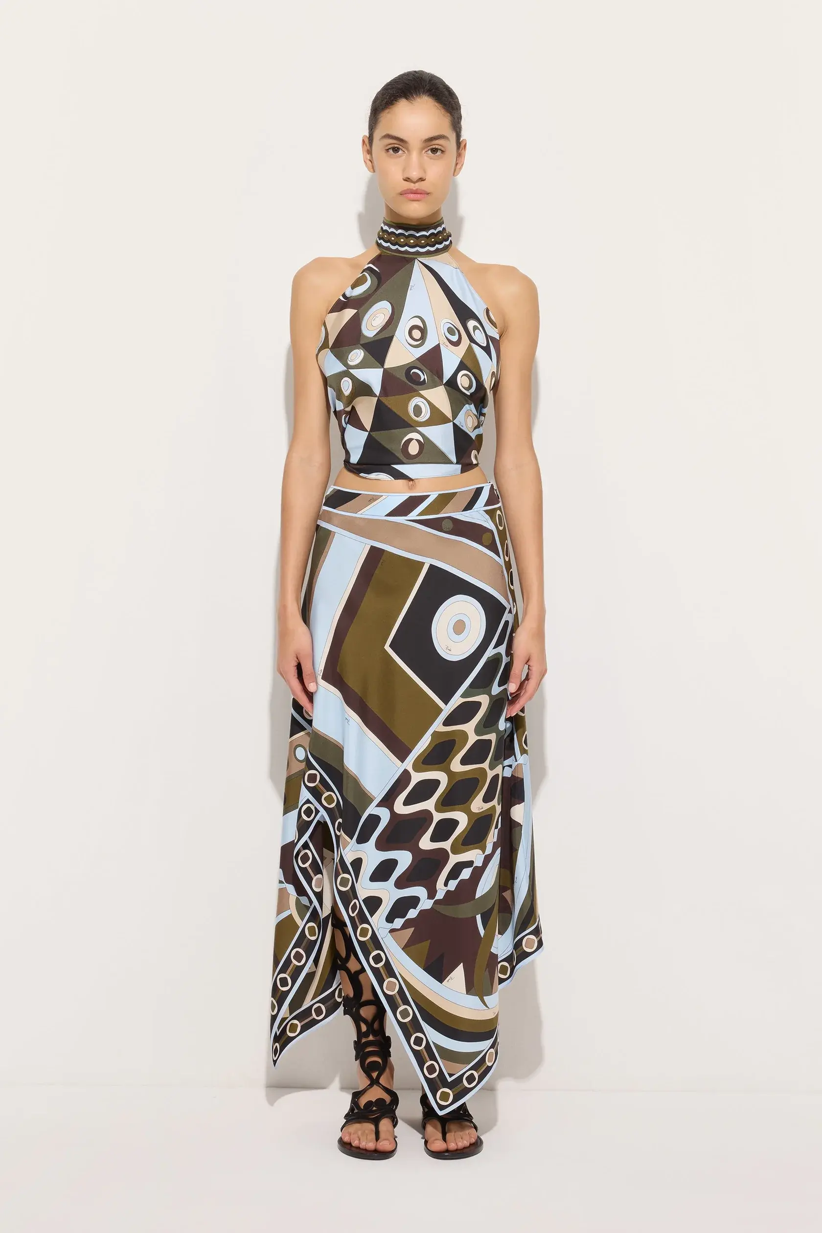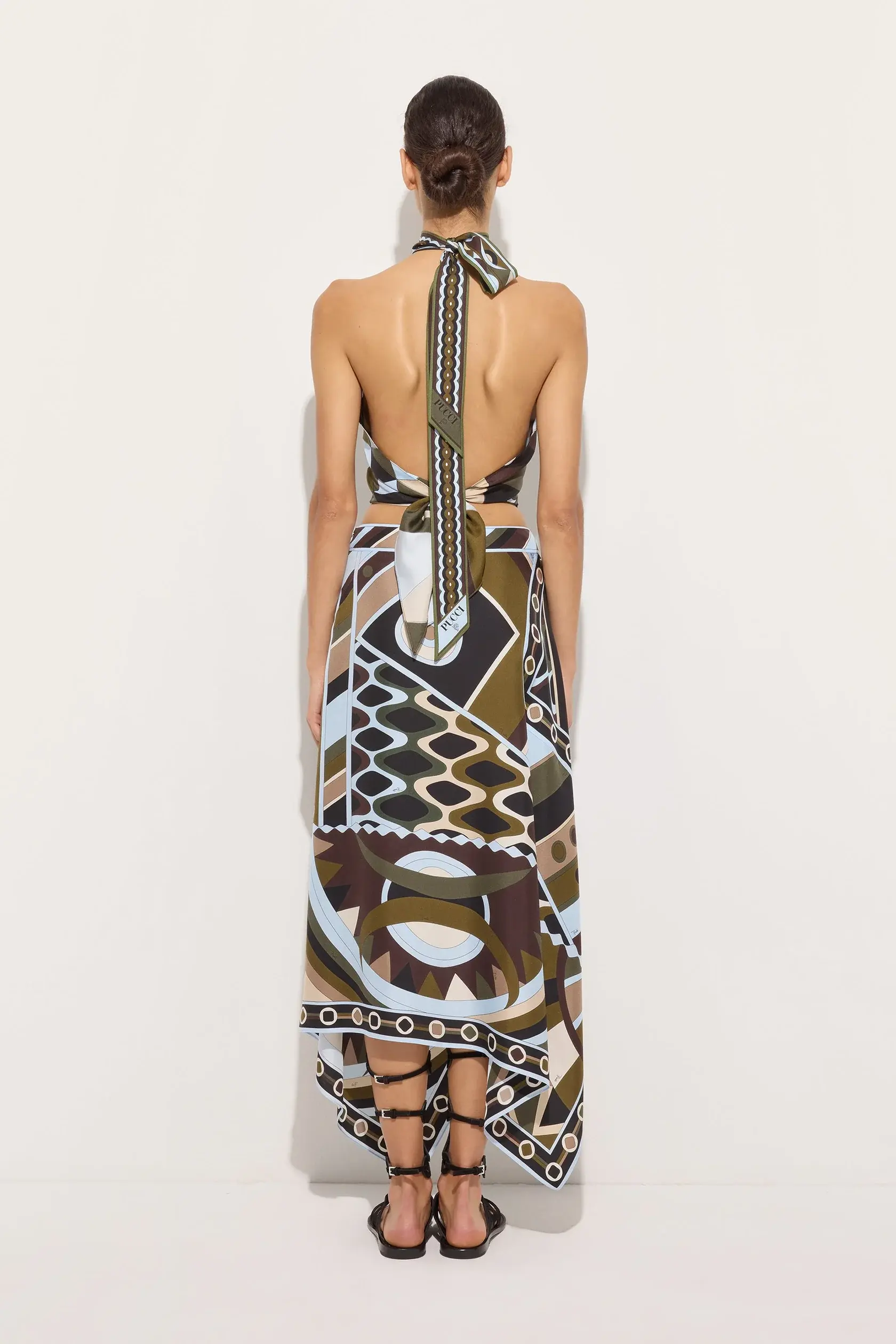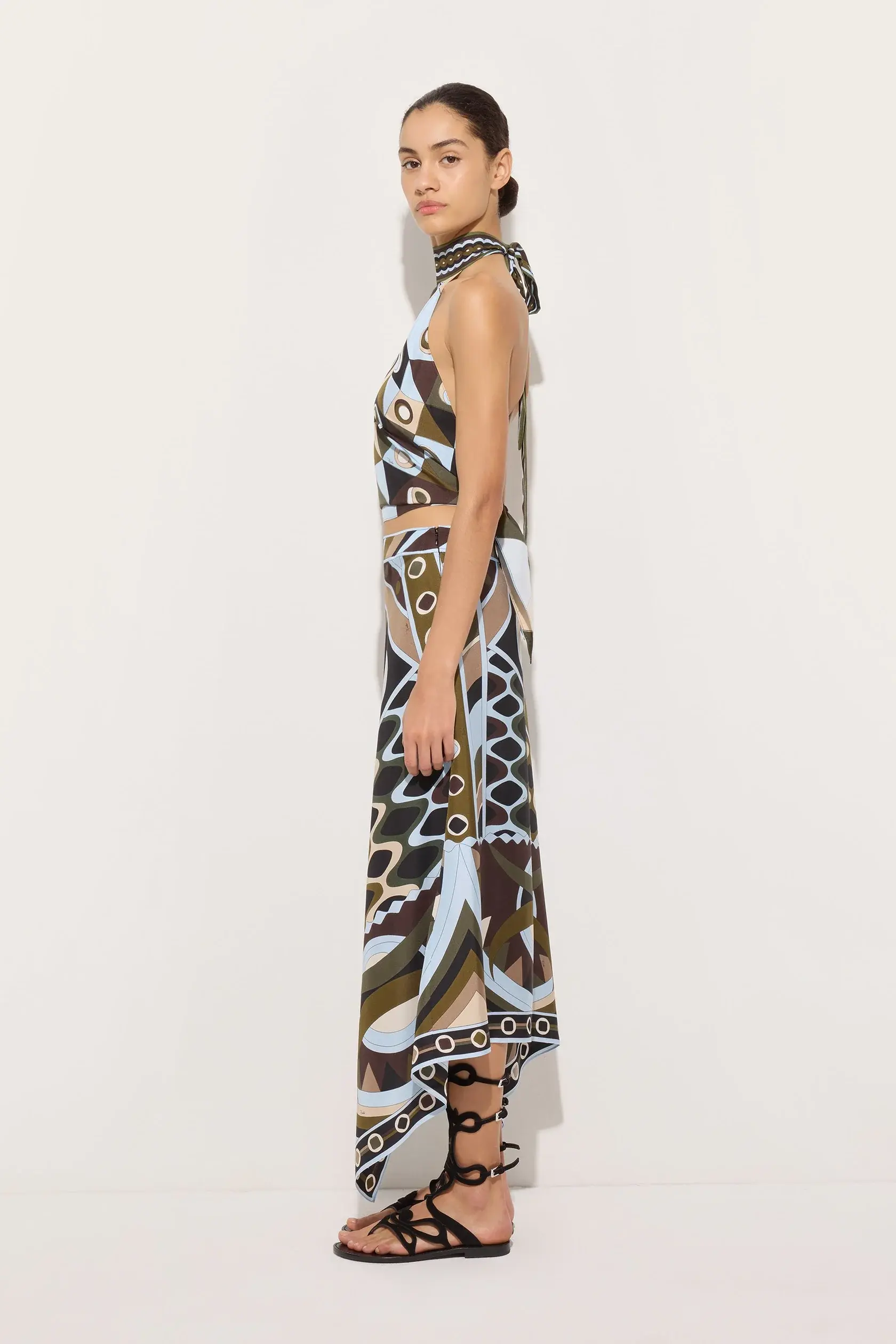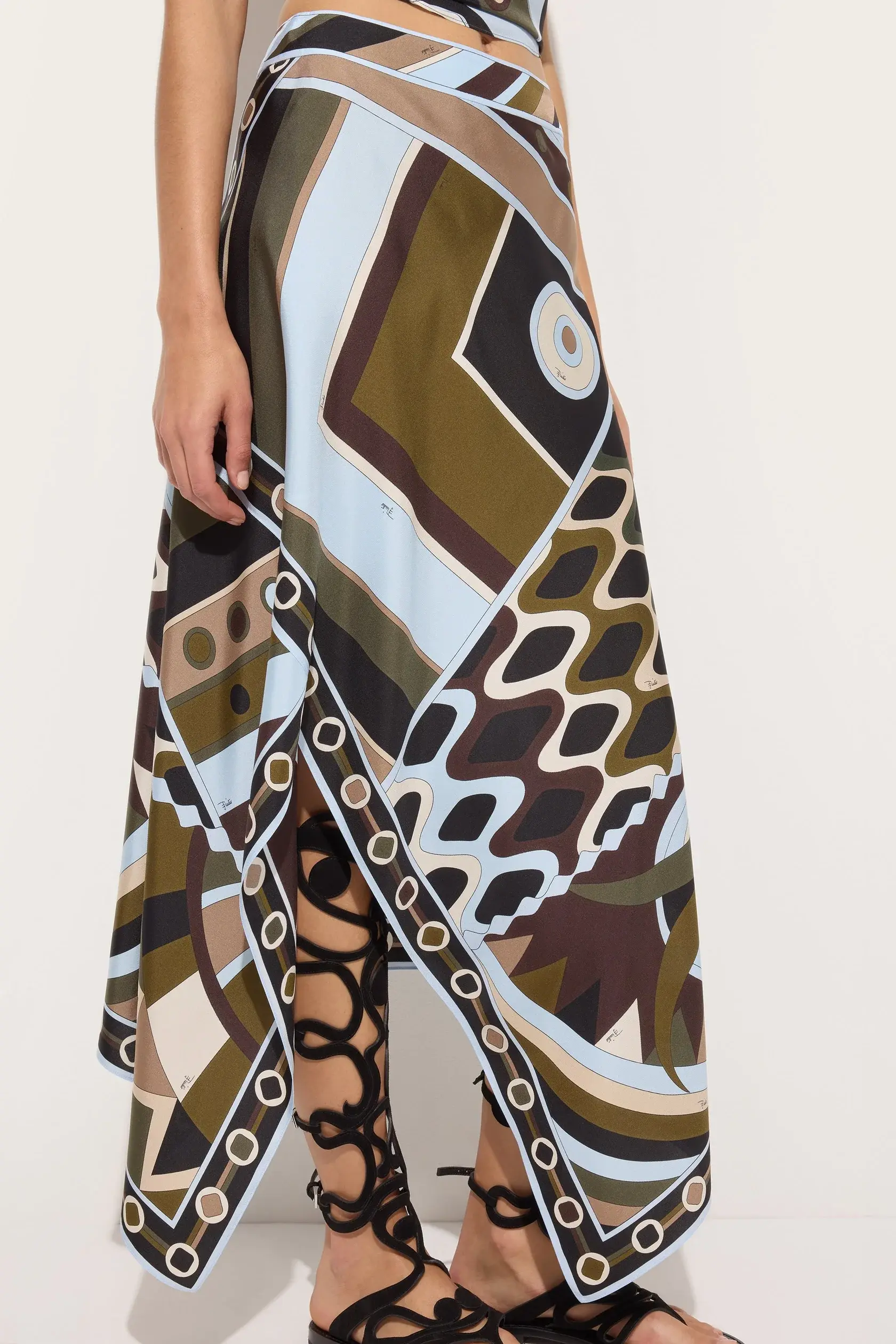 A skirt with fluid movement and bold graphic lines, inspired by the iconic aesthetic of the silk. Crafted in silk twill, it features an asymmetrical construction that accompanies the body with natural lightness. Contrasting printed edges frame the silhouette, emphasizing the dynamism of the design and the depth of the pattern. The Vivara print in shades of khaki and blue crosses the surface with a vibrant and timeless rhythm, creating an elegant garment with a strong personality.