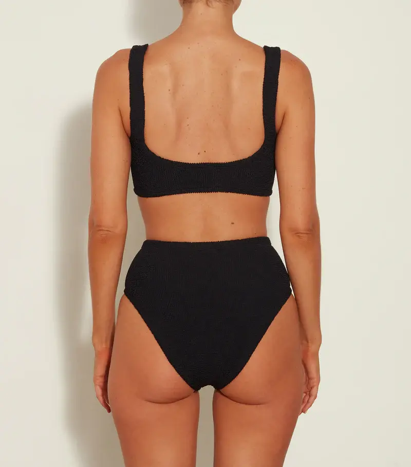 She's got it all. Nadine's high-waisted bikini bottoms and tortoiseshell hoop detailing have comfort with a serving of understated glamour.