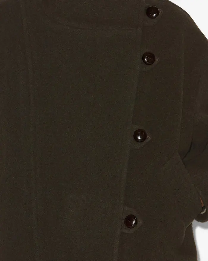 Short wool blend coat Stand-up collar Long sleeves with button tabs Asymmetrical button tab Side pockets Unlined Cropped cut