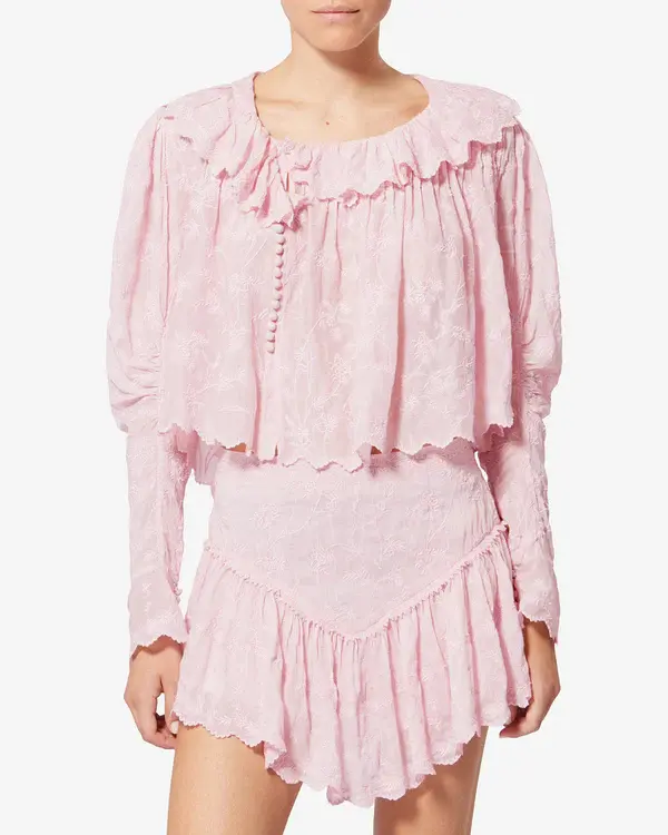 Cotton and silk top with floral embroidery Round neckline with frill Button tab on the side under the chest Long mutton sleeves with buttoned cuffs