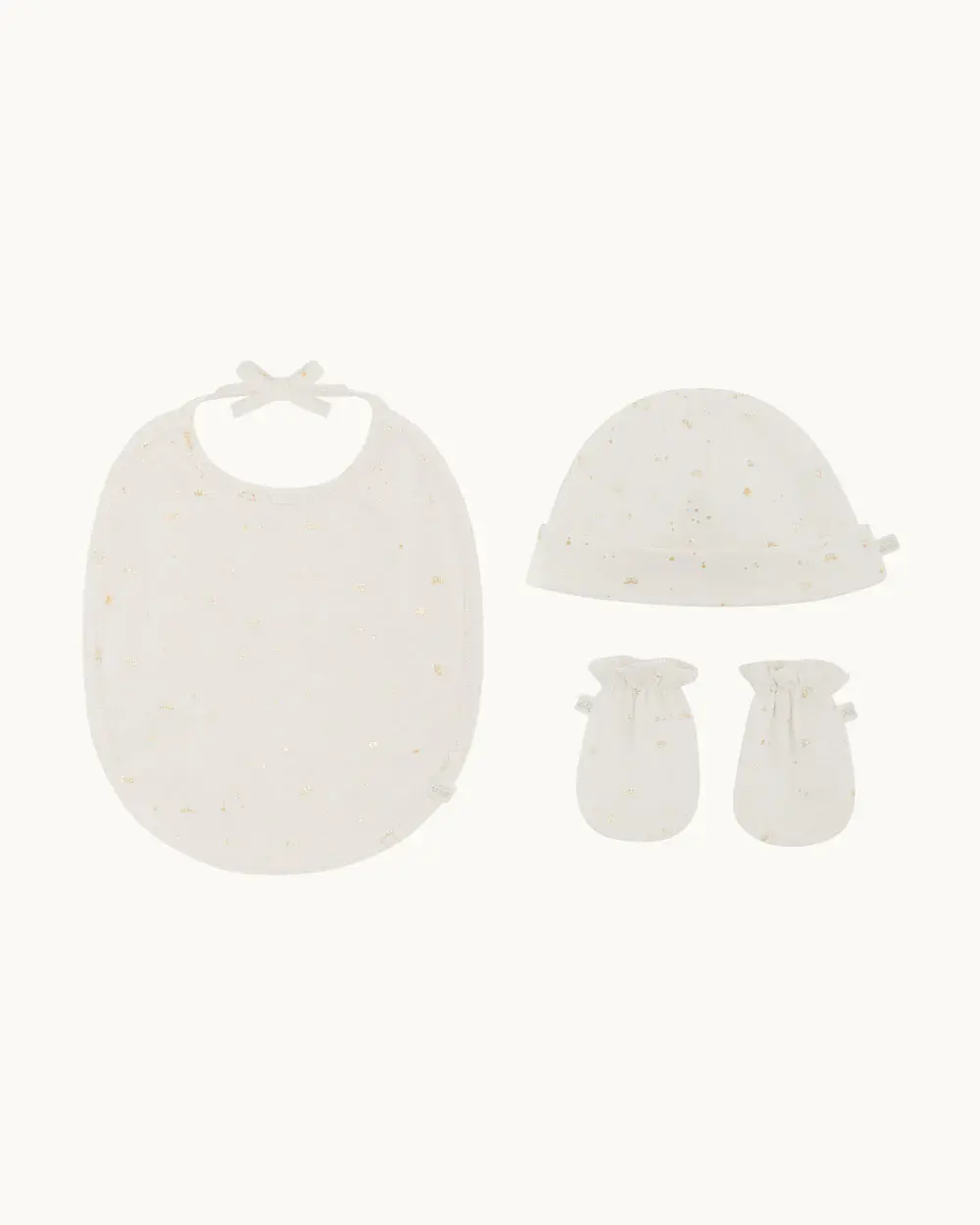 A perfect gift for a newborn, the Bay Star & Crown Set for baby includes a soft bib with bow detail and snap closure, a matching hat, and mittens in gentle Pima cotton. Each detailed with our signature ‘Star & Crown’ print in shimmering gold.