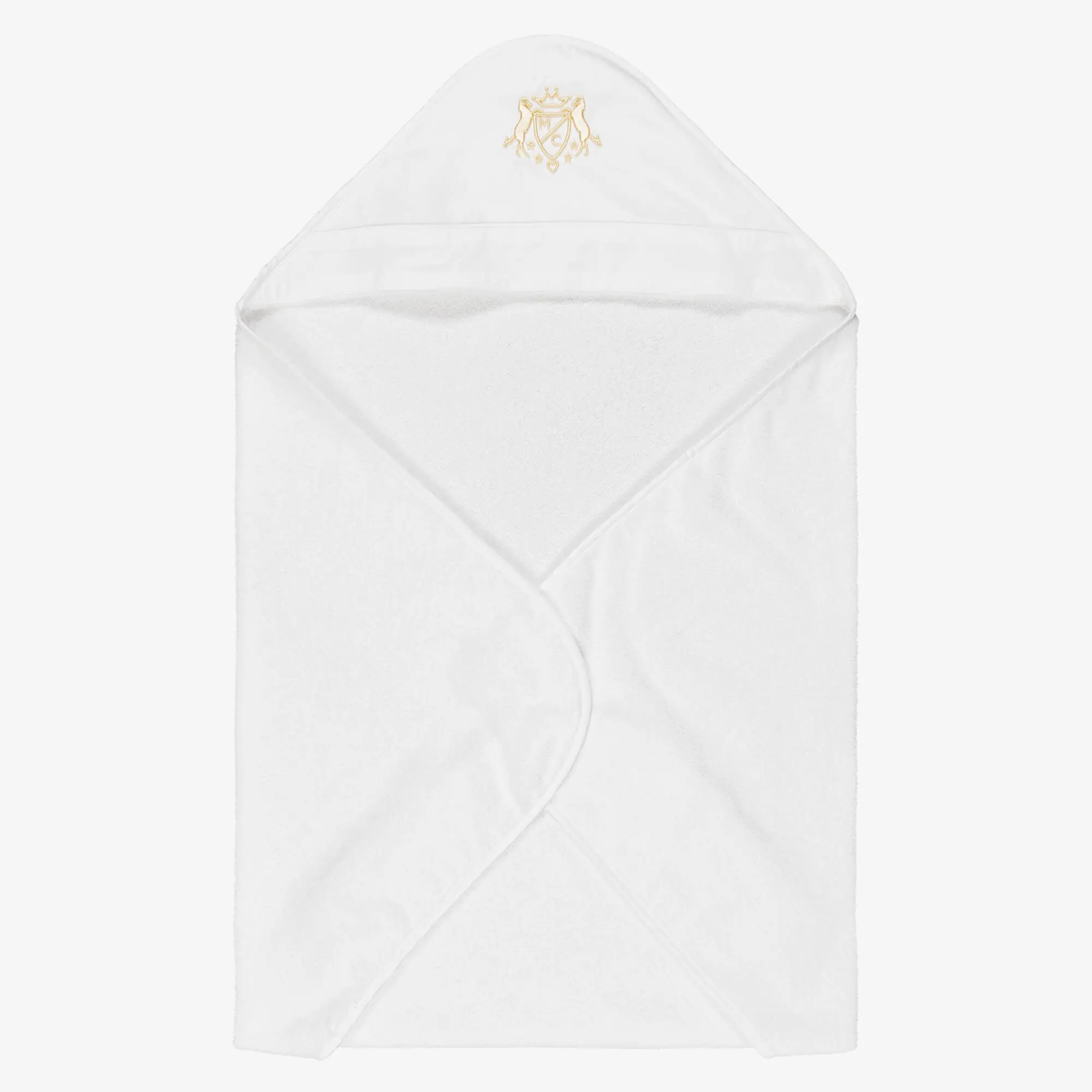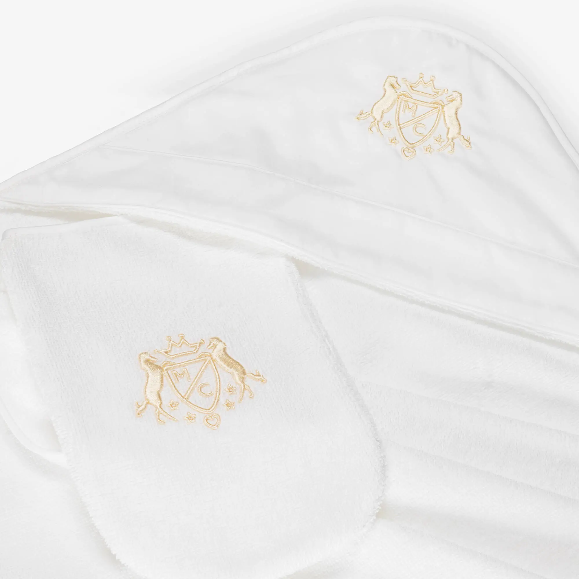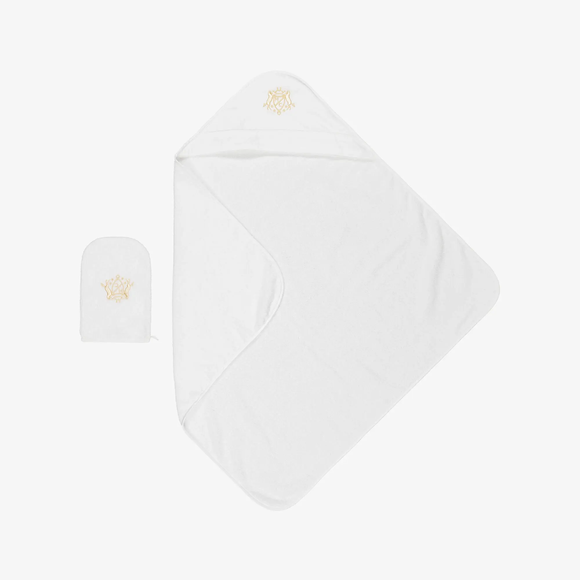 White Cotton Hooded Towel & Mitt Set with Gold Crest