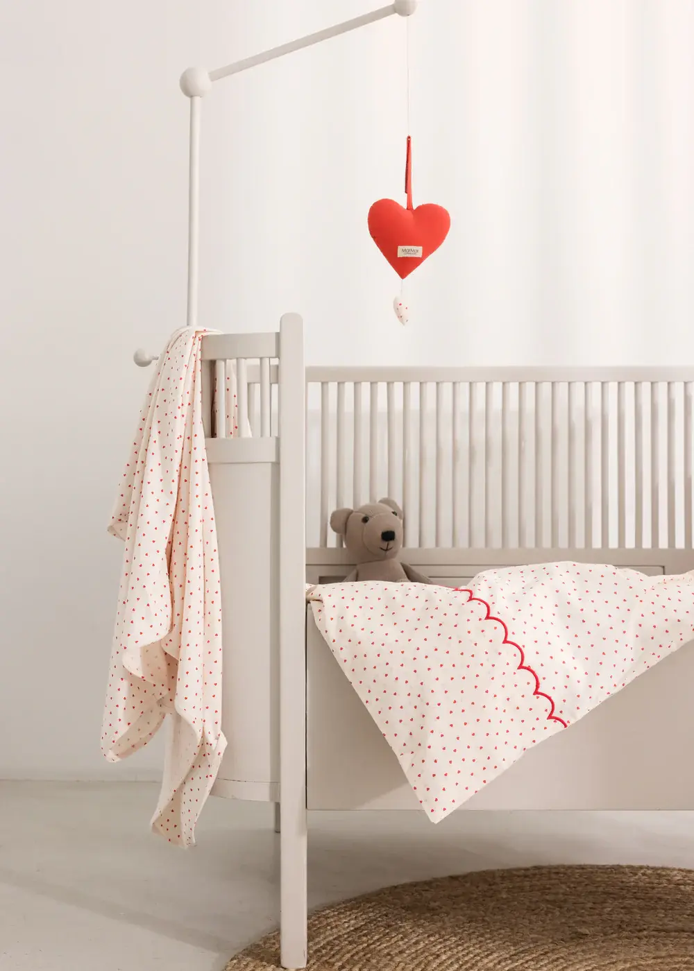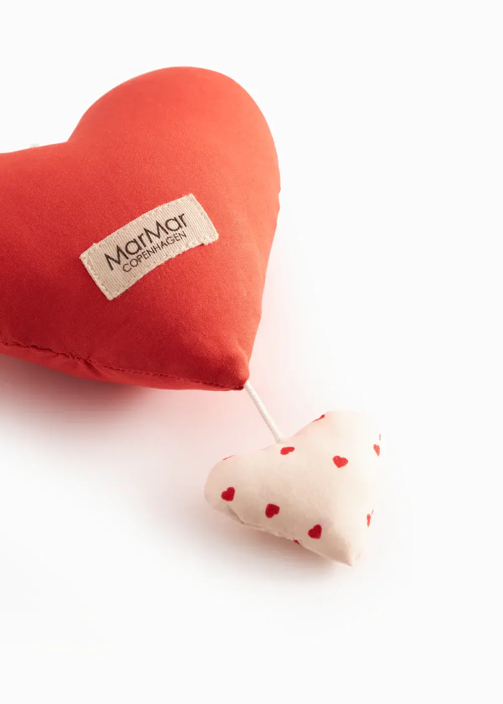 Musical alarm clock with two beautiful hearts that play Brahm's Lullaby for your child when you pull the string. The alarm clock has a Velcro closure, so you can easily hang it on the bed or changing table. The alarm clock measures 28 cm. in circumference.
