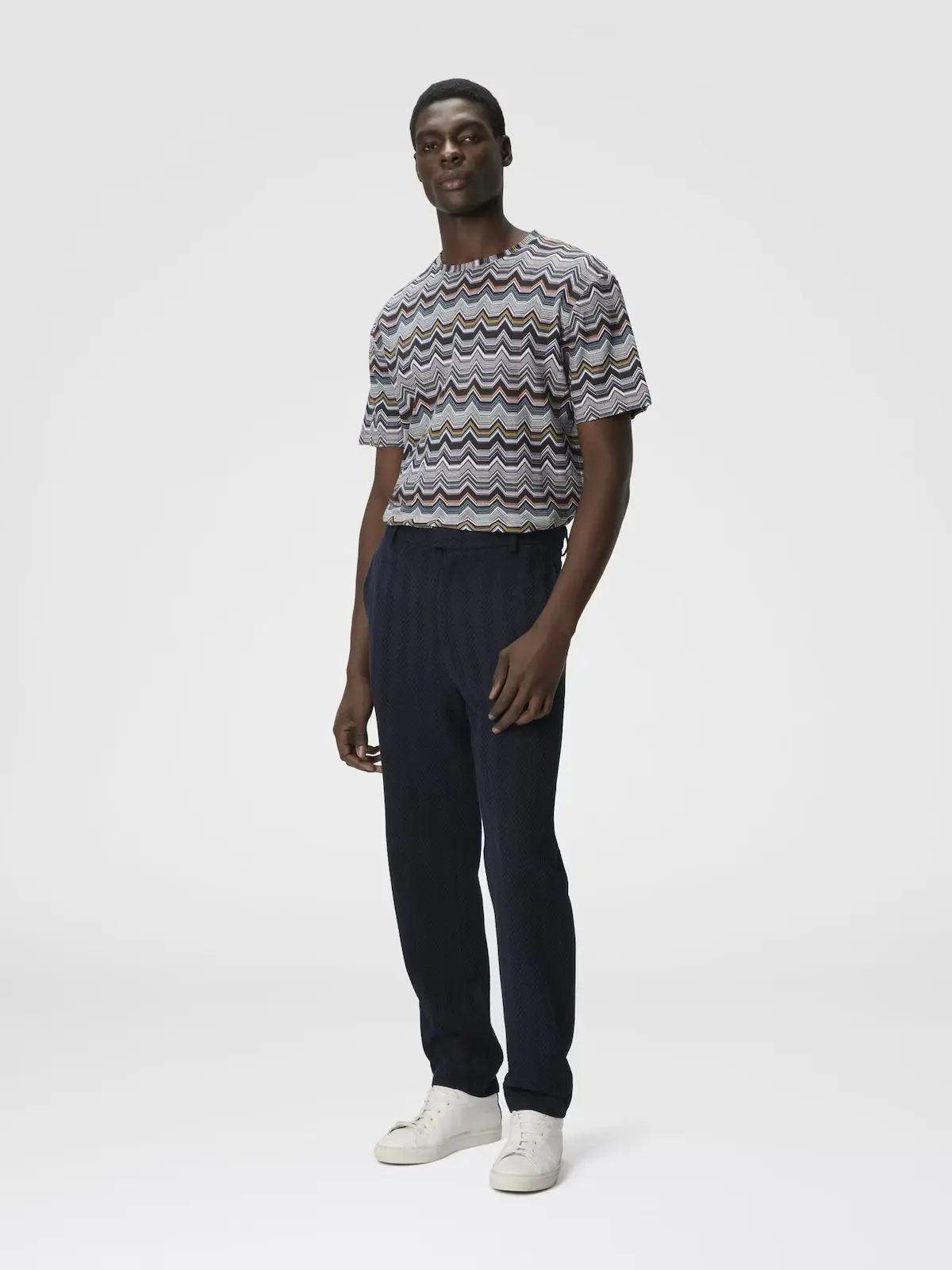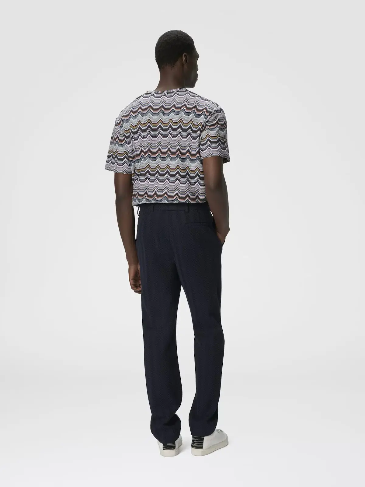 The straight cut highlights the elegant line of these men’s trousers in tone-on-tone zigzag patterned fabric. The waistband loops, concealed closure, side pockets, and pressed front crease enhance the classic nature of the model.