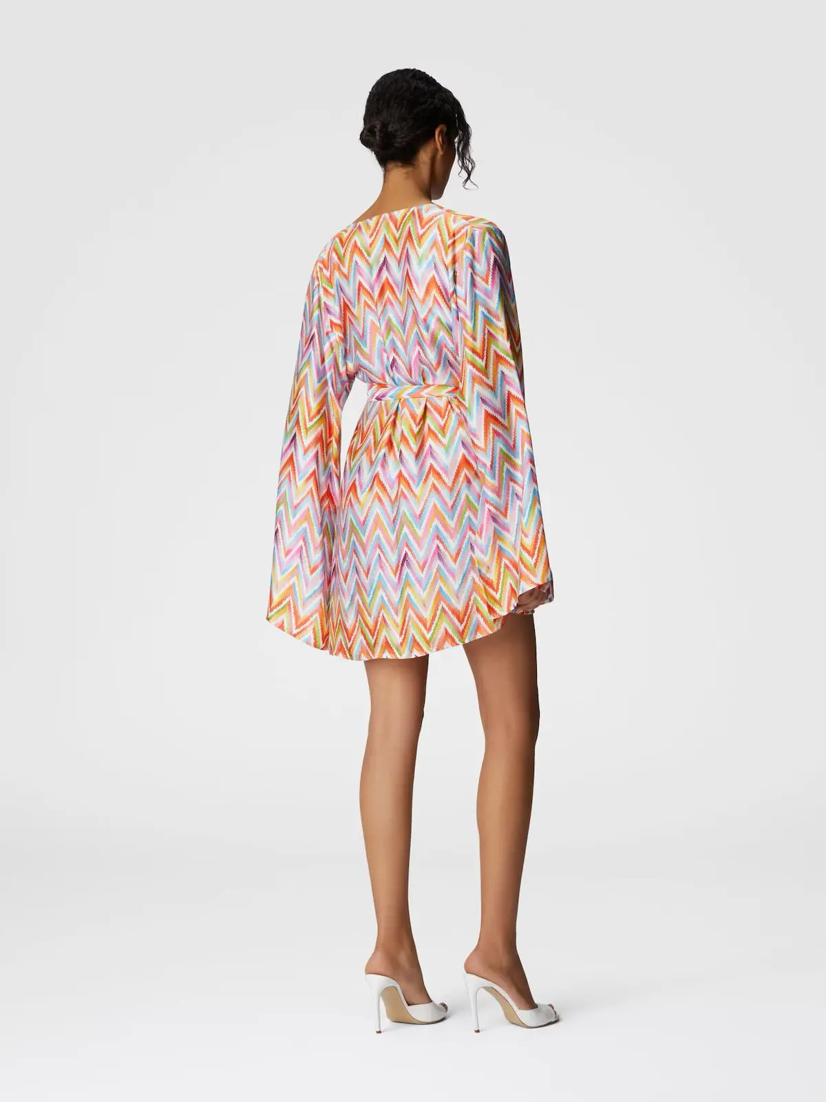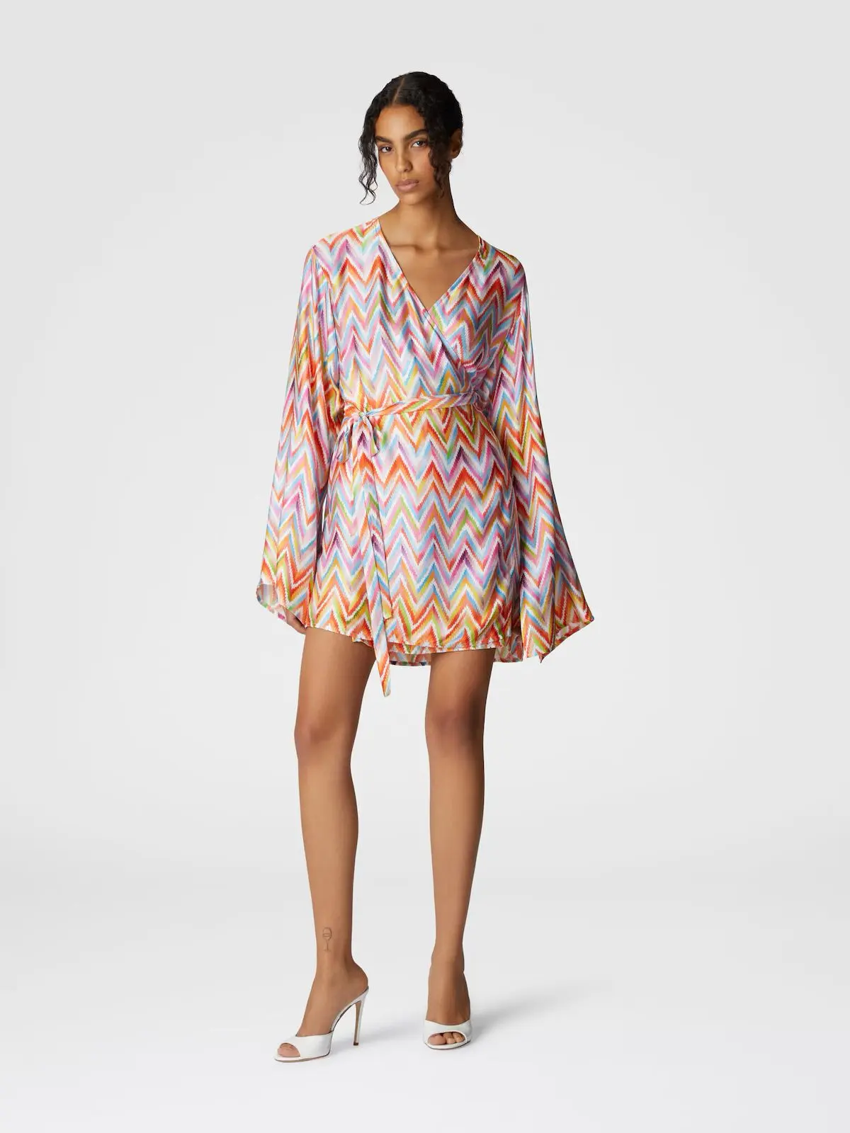 With vintage elegance, this short cover-up with a kimono design features a viscose twill belt with the iconic zigzag pattern. The flared sleeves and ‘70s allure complete a captivating garment.