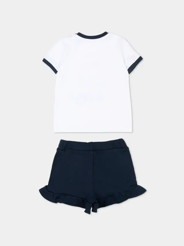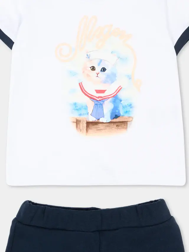 Short sports set in cotton jersey by MSGM Kids consisting of a white T-shirt and navy blue shorts. The T-shirt features a crew neck and contrasting sleeve edges, snap buttons on the shoulder, and a front print of a kitten in a marinière style on a watercolored background. The coordinated shorts have a soft elasticated waist and a small embroidered logo on the leg. Ruffles at the bottom of the leg add a delicate movement, completing the ensemble with a balance between playful graphics and essential lines.