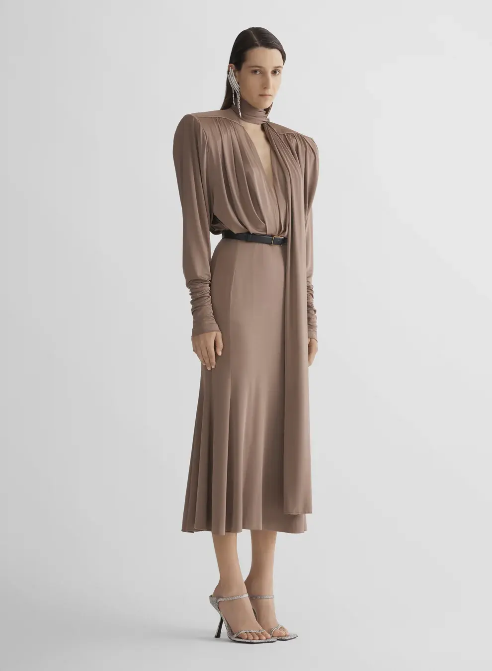 Draped sheath dress in light shiny jersey Wrapped scarf collar with a plunging V-neckline Statement padded shoulders Invisible zipper Side-seam pockets Flared skirt Mid-calf length