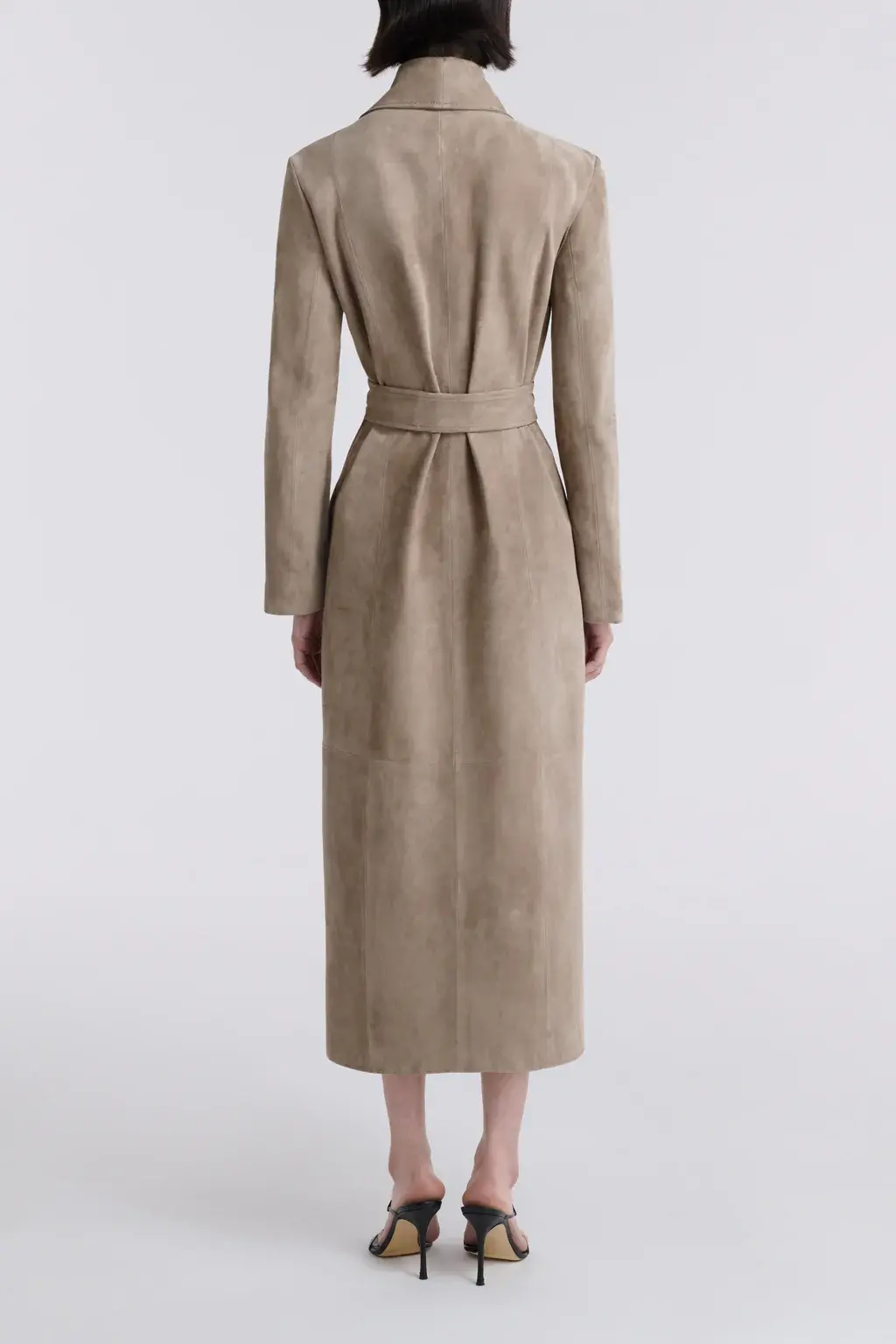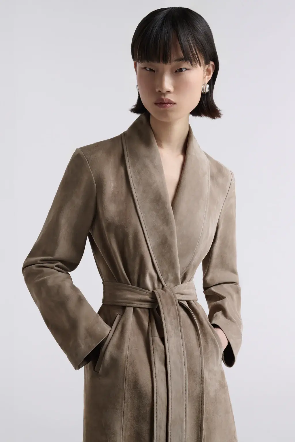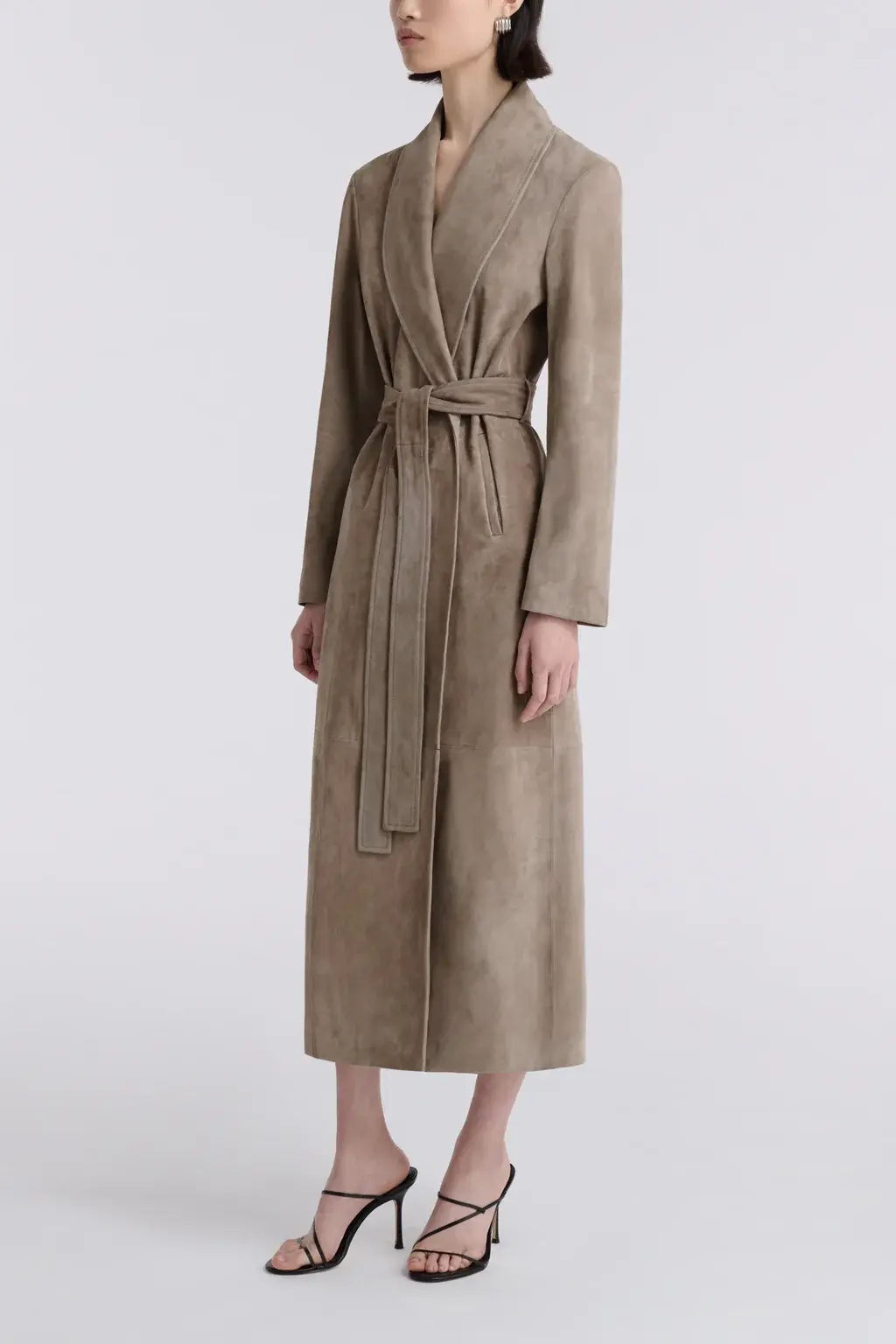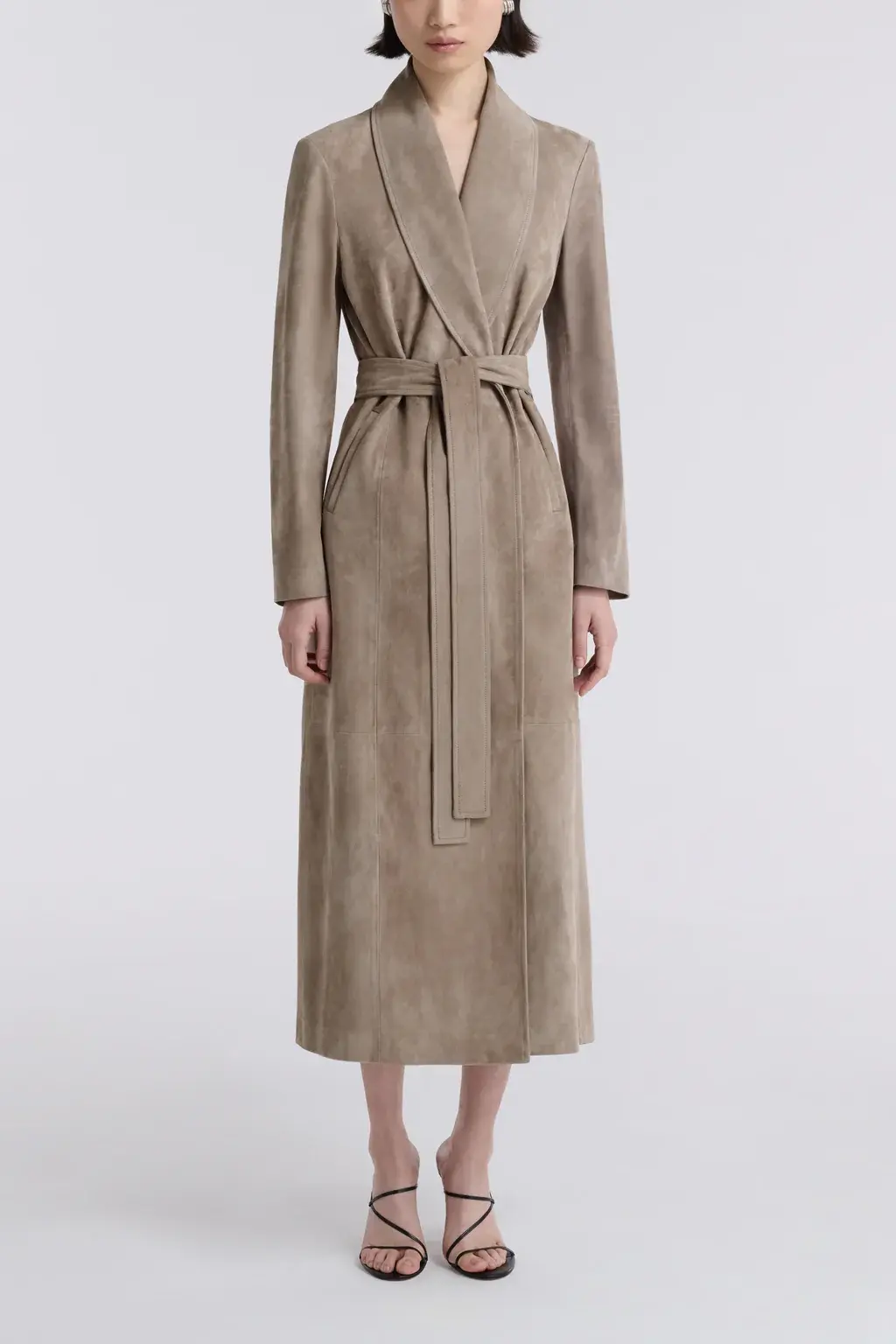 A longline trench in supple suede with a fluid, velvety drape. Softly tailored with a wrap front and self-tie belt to define the waist. Finished with discreet pockets and a clean, uninterrupted silhouette.