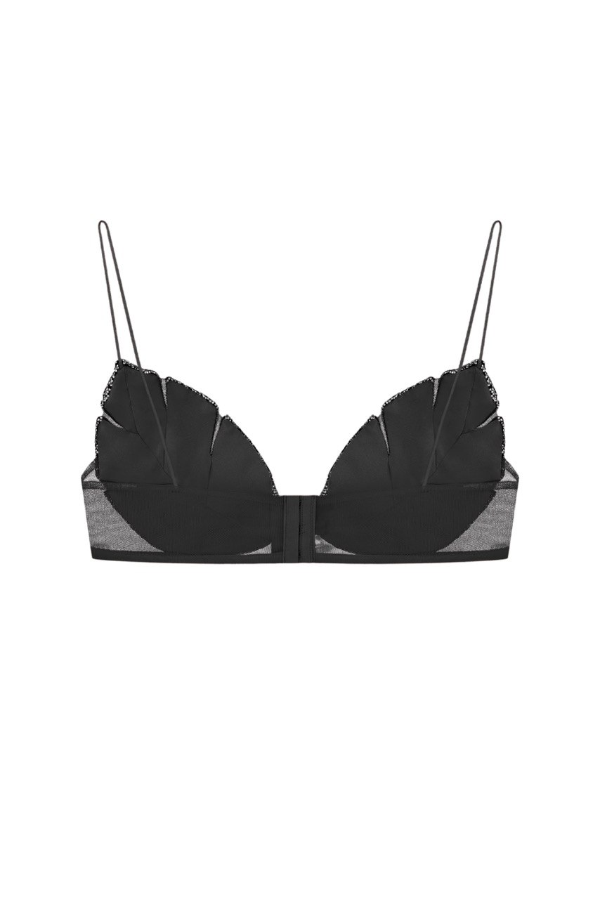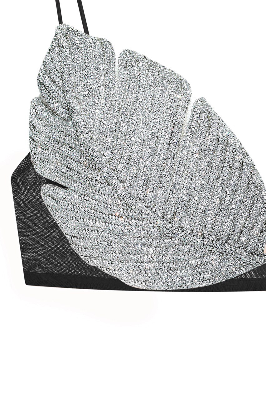 A bralette embellished with tropical leaves from Nué signature rhinestone cords with delicate black mesh wings.