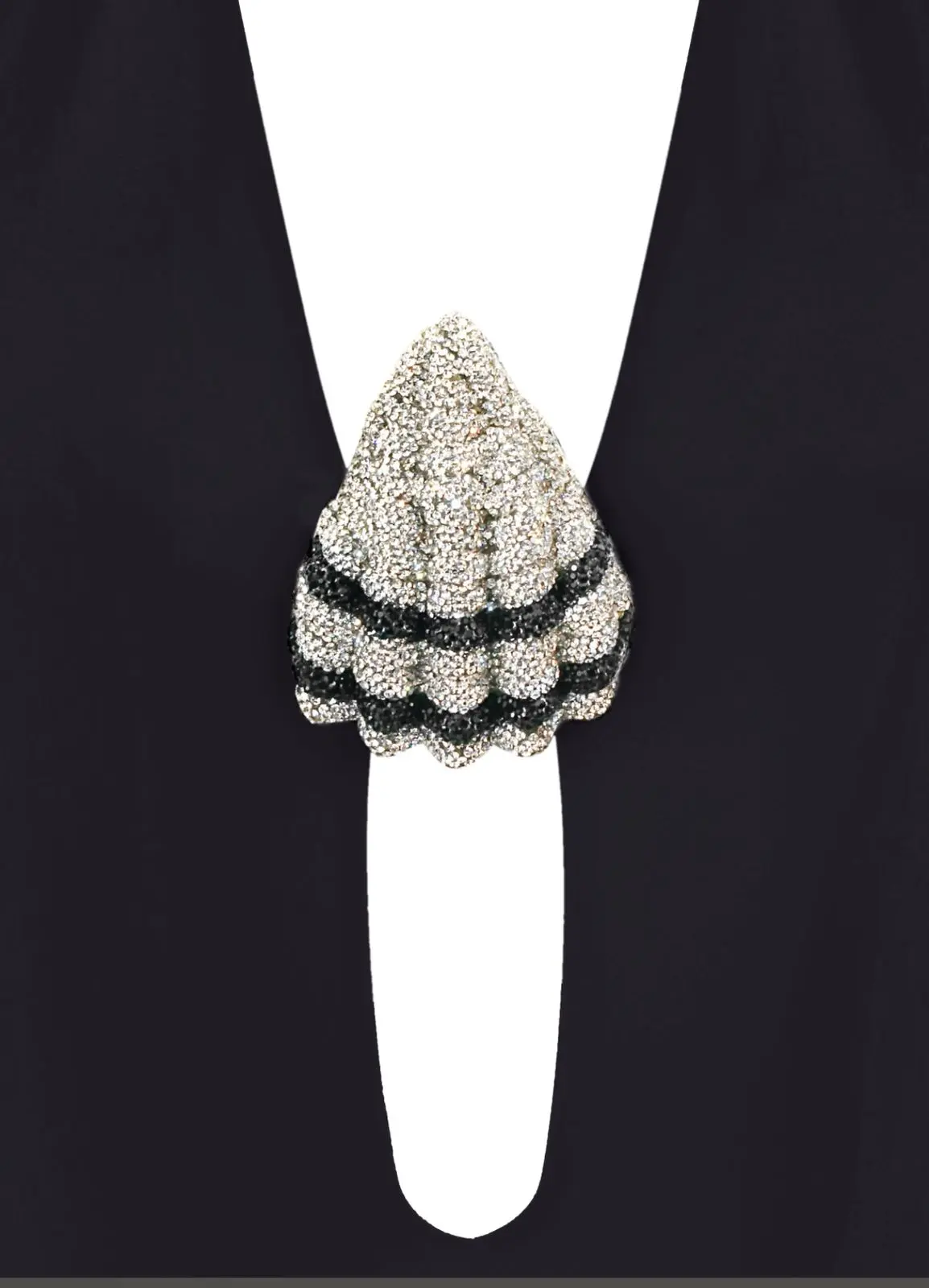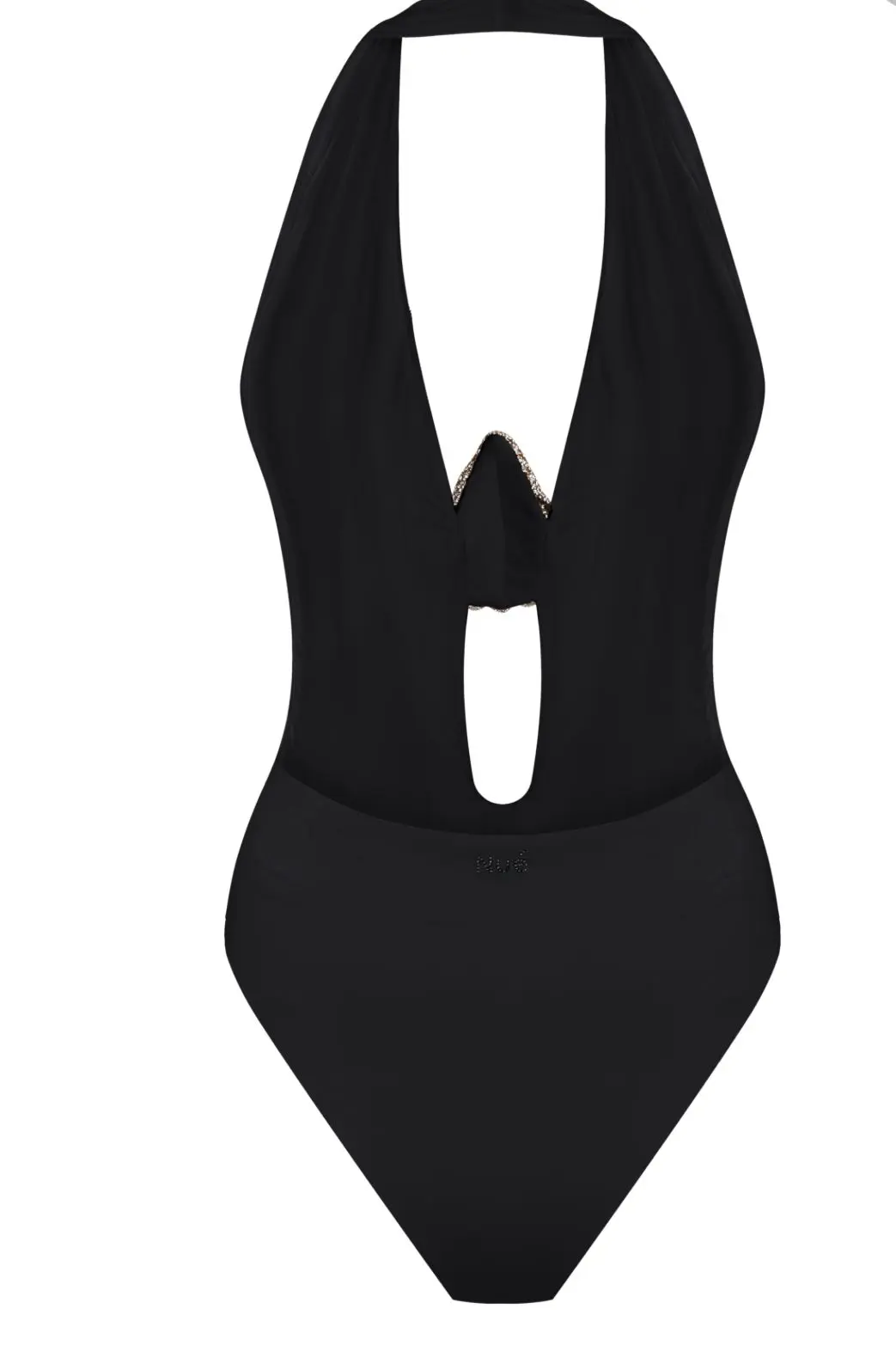 A one-piece swimsuit features a halter, backless, high-cut leg silhouette with a deeply plunged neckline adorned with seashell decoration made from Nué signature rhinestone fabric.