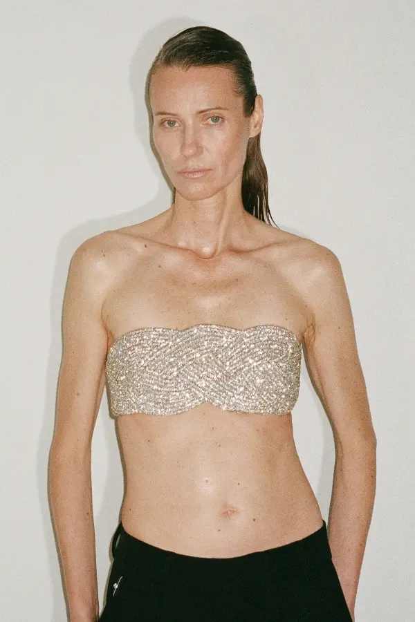 A strapless bandeau bra made from Nué signature rhinestone cords features a braided design and is finished with an elasticated nude base. It secures with a back clasp.