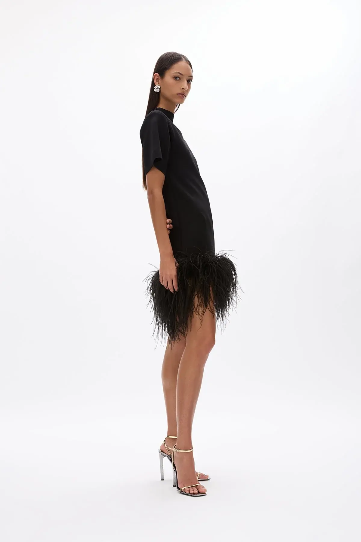 Inspired by the best-selling Linc mini, the Rita Mini is nothing short of a sartorial sensation. Made from midnight-black crepe, it has a modern turtleneck and cascades to an A-line hem. The floaty feathers will enhance movement on the dance floor or at dinner.
