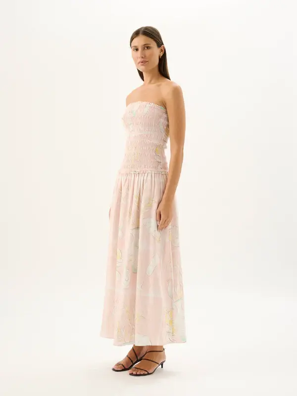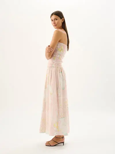 The best-selling Millie Dress is reimagined in the new hand-painted Caspia print. Showcasing flattering ruching details throughout the bodice and cascading into a flowing maxi skirt, style the Millie Dress with flat sandals for a relaxed day look, or elevate with a statement heel for evening sophistication.
